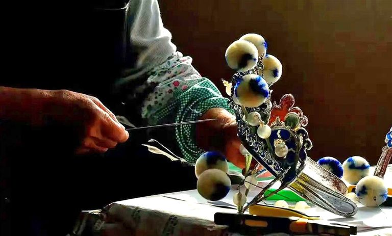绘图、雕版、拔丝、加纱、烫壳、弹丝、沥粉、绷面、贴金……冯侨介绍,冯氏盔头上的绒球是最常用的配饰,讲究色正、形圆、体轻,染色、刷绒、整形都得靠手工完成,制作一顶完整的盔头从制图到雕刻再到最后装饰,大大小小要历经上百道工序,平均制作周期约1个月。