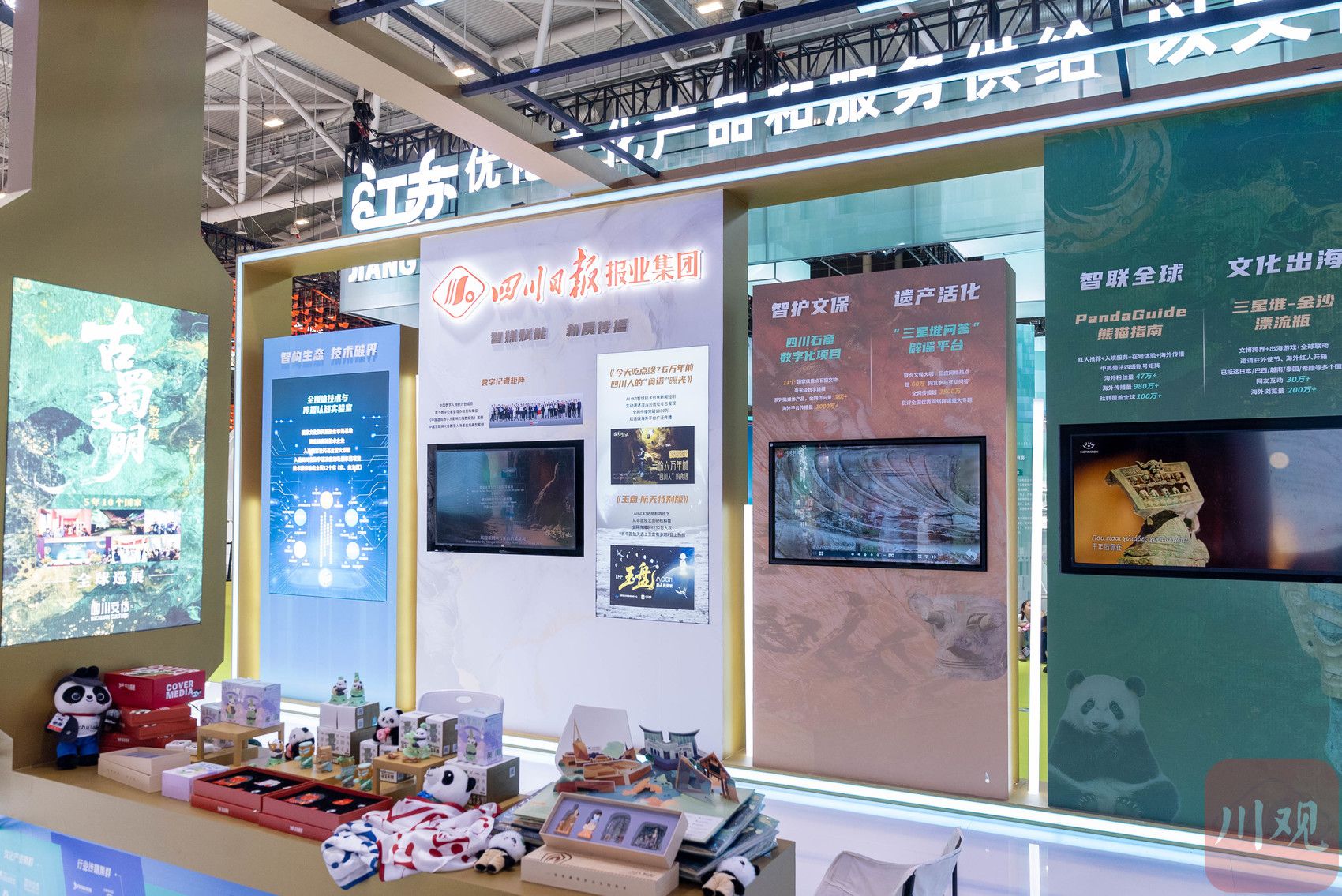 在四川日报报业集团展台,通过“智构生态 技术破解”“智媒赋能,新质传播”“智护文保 遗产活化”“智联全球 文化出海”四大板块,展示了全媒体技术与传播认知实验室、数字记者矩阵、四川石窟数字化项目、“三星堆问答”辟谣平台以及面向海外的Panda guide(熊猫指南)、三星堆-金沙漂流瓶等多项传媒+科技、传媒+旅游等方面的创新探索。