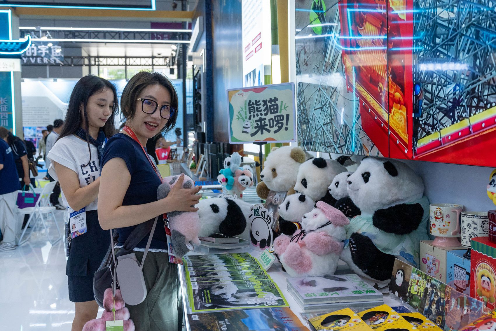 一样的萌宠可爱,不一样的特色造型。在四川展馆,把“大熊猫”玩出了花。展区入口,大熊猫文化创意大赛获奖作品雅乐团团和赤竹侠,热情欢迎八方来客。在“熊猫家园”区域,工作人员介绍,此次带来了几十种熊猫文创,从熊猫书签,到仿真版熊猫“花花”,还有各式熊猫书籍,令大家爱不释手。一旁,熊猫造型机器人“小潘”,也热情回答着观众提问,介绍四川的好吃好玩和好耍。还有“新白娘子传奇”系列熊猫玩偶,也展现着四川味、巴蜀韵。