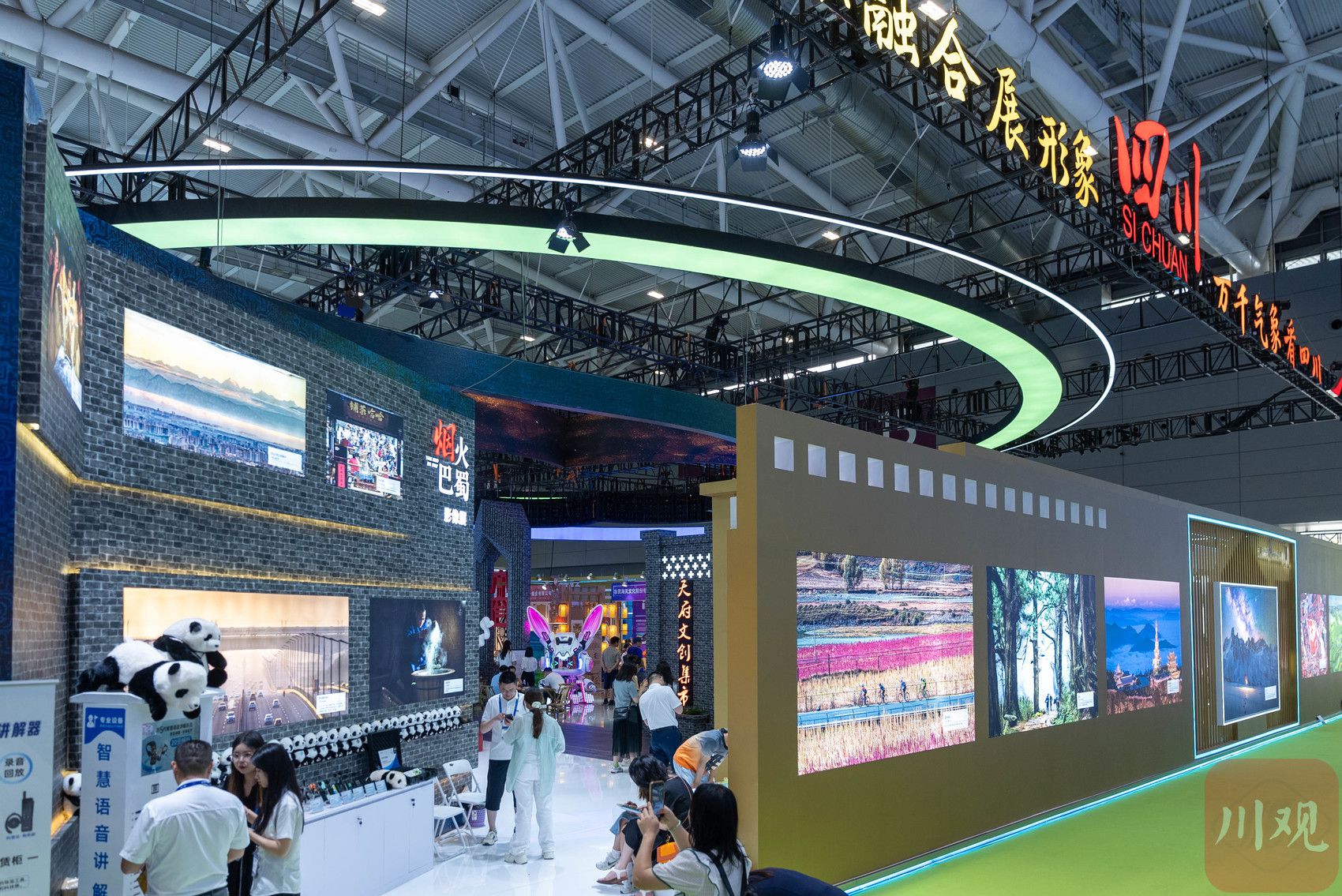 位于15号馆的四川展馆,聚焦“文旅融合展形象 万千气象看四川”主题,在总面积990平方米中打造多个沉浸式场景,分为重点场景展示区、文化和科技融合展示区、文化和旅游融合展示区和天府文创集市展示区四大区域,集聚全省73家重点文化企业,以“传统+科技”立体化呈现我省积极培育新型文化企业、发展新型文化业态、推动新型消费模式的新成果,铺展出融合巴蜀美学与现代创意的丰富画卷。