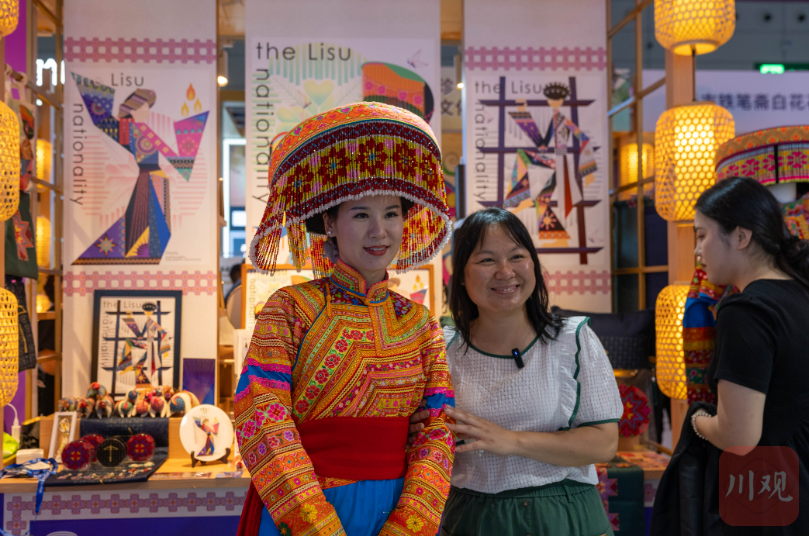 可逛可看可买,此次四川还把“宽窄巷子”等地标搬进展馆,打造出具有“烟火气”的天府文创集市区:竹编灯笼、三星堆盲盒、川剧盔帽、苗族扎染、傈僳族服饰、绵竹年画等等吸引大批逛展观众,还有服饰走秀、四川盘子、年画拓印等活态展示,展现传统工艺时代活力。展区工作人员介绍,围绕“锦绣四川”,今年还特别集中展陈了蜀绣、羌绣、彝绣、苗绣等特色文创,也从这些创意与蜀韵共潮生的非遗产品中感受“安逸四川”的无限魅力。