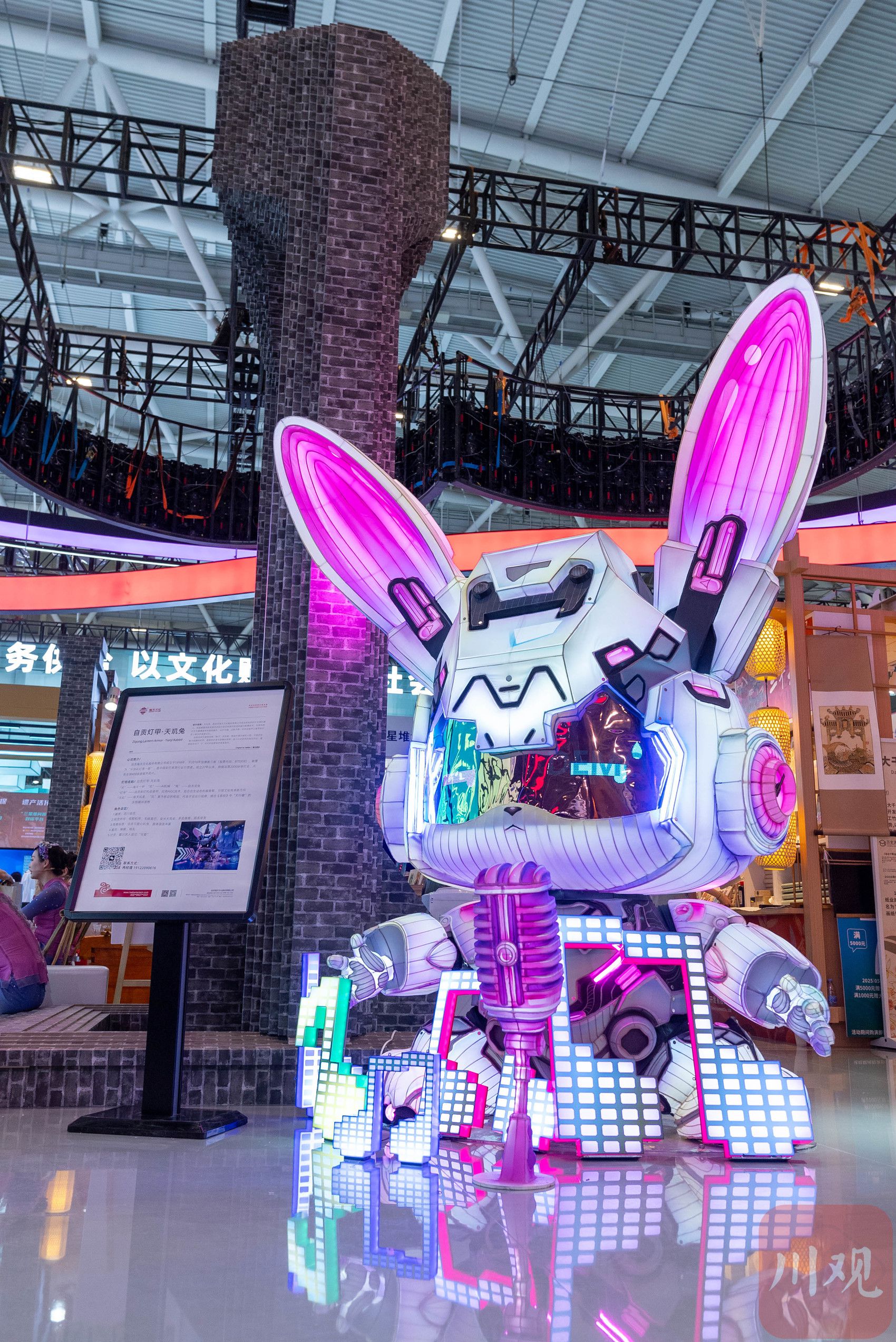 来自自贡海天文化的原创设计的机甲“天玑兔”,以整体彩灯工艺融合现代动态机械装置,内置语音互动设备,成为现场高人气打卡装置。工作人员冉秋平介绍,此次来到文博会,还特别带来了多个自贡彩灯小型摆件,让逛展观众可以把这些精湛技艺带回家。