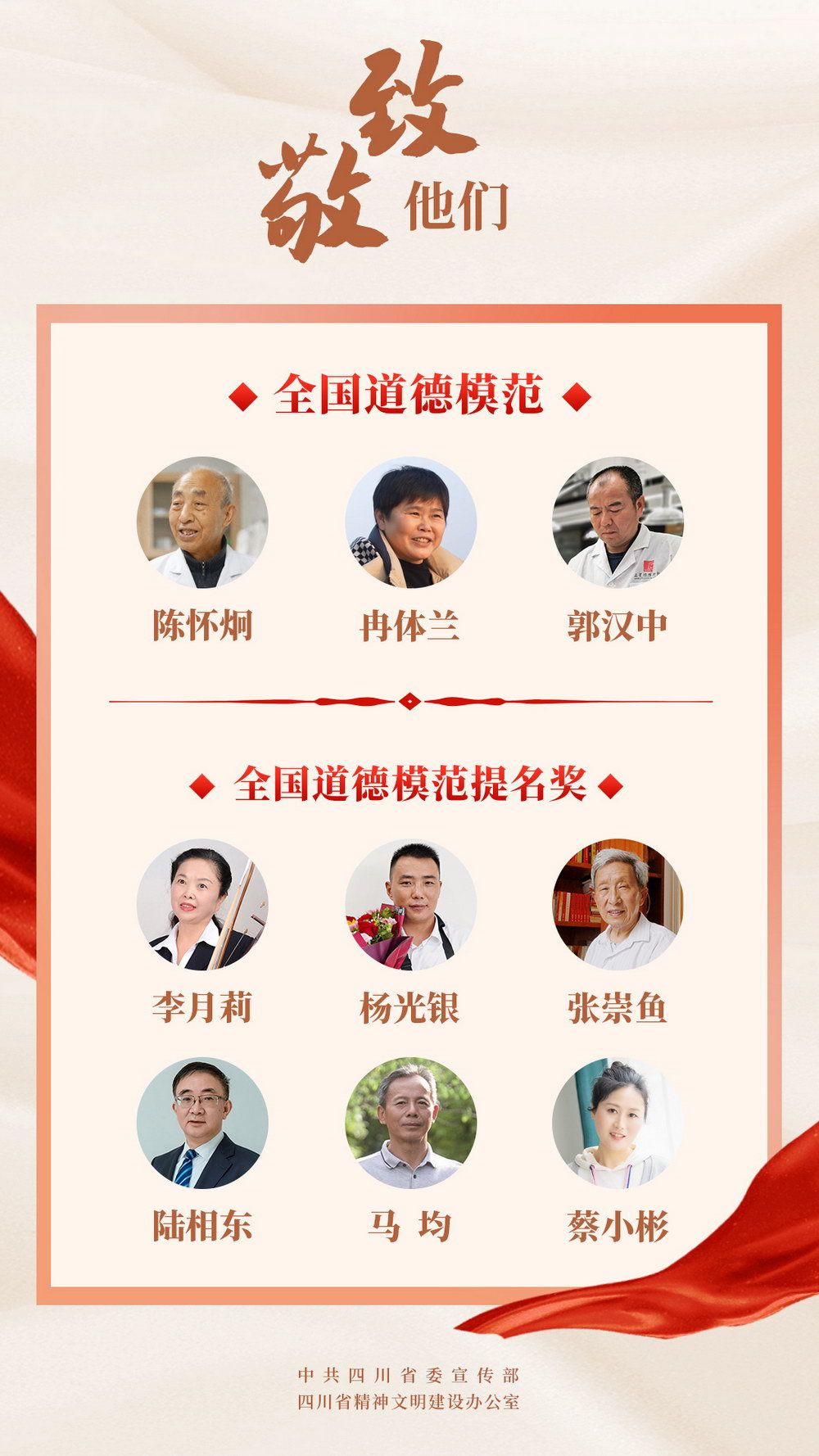 全国道德模范方面,陈怀炯、冉体兰、郭汉中等3名候选人被授予全国道德模范荣誉称号,李月莉、杨光银、张崇鱼、陆相东、马均、蔡小彬等6名候选人被授予全国道德模范提名奖。据了解,四川获得本届全国道德模范荣誉称号的人数居全国第一;截至目前,共有18人被授予全国道德模范荣誉称号,70人被授予全国道德模范提名奖。