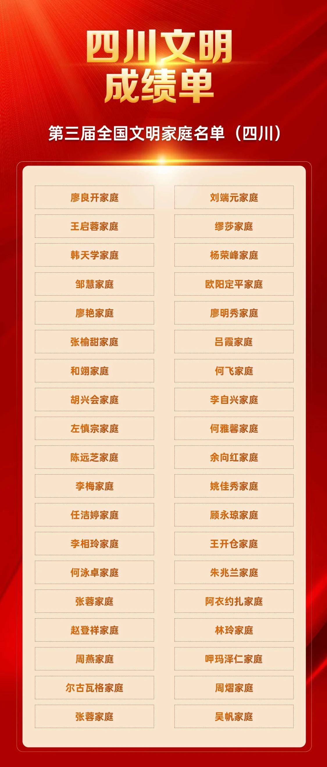 全国文明村镇方面,四川本轮有157个村镇被授予全国文明村镇称号,累计创成全国文明村镇共430个;全国文明单位方面,四川本轮有142个单位被授予全国文明单位称号,累计创成全国文明单位共468个;全国文明家庭方面,四川本轮有38户家庭被授予第三届全国文明家庭称号,累计创成全国文明家庭共73户;全国文明校园方面,四川本轮有36所学校被授予第三届全国文明校园称号,累计创成全国文明校园共83所(其中高校7所,中小学76所)。