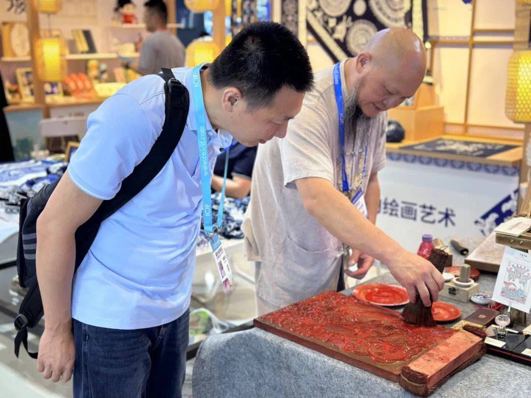 大千纸业打造的“竹纸+年画”双非遗体验场景尤为惊艳。印度游客尝试木板拓印后连连称赞,湖北游客试纸后感叹:“古法手工纸的韧性令人震撼!”这种“可触摸的非遗”模式,让传统文化传播更具感染力。