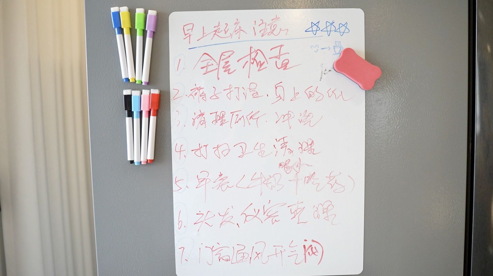贴在冰箱上的“早上起床注意事项”。