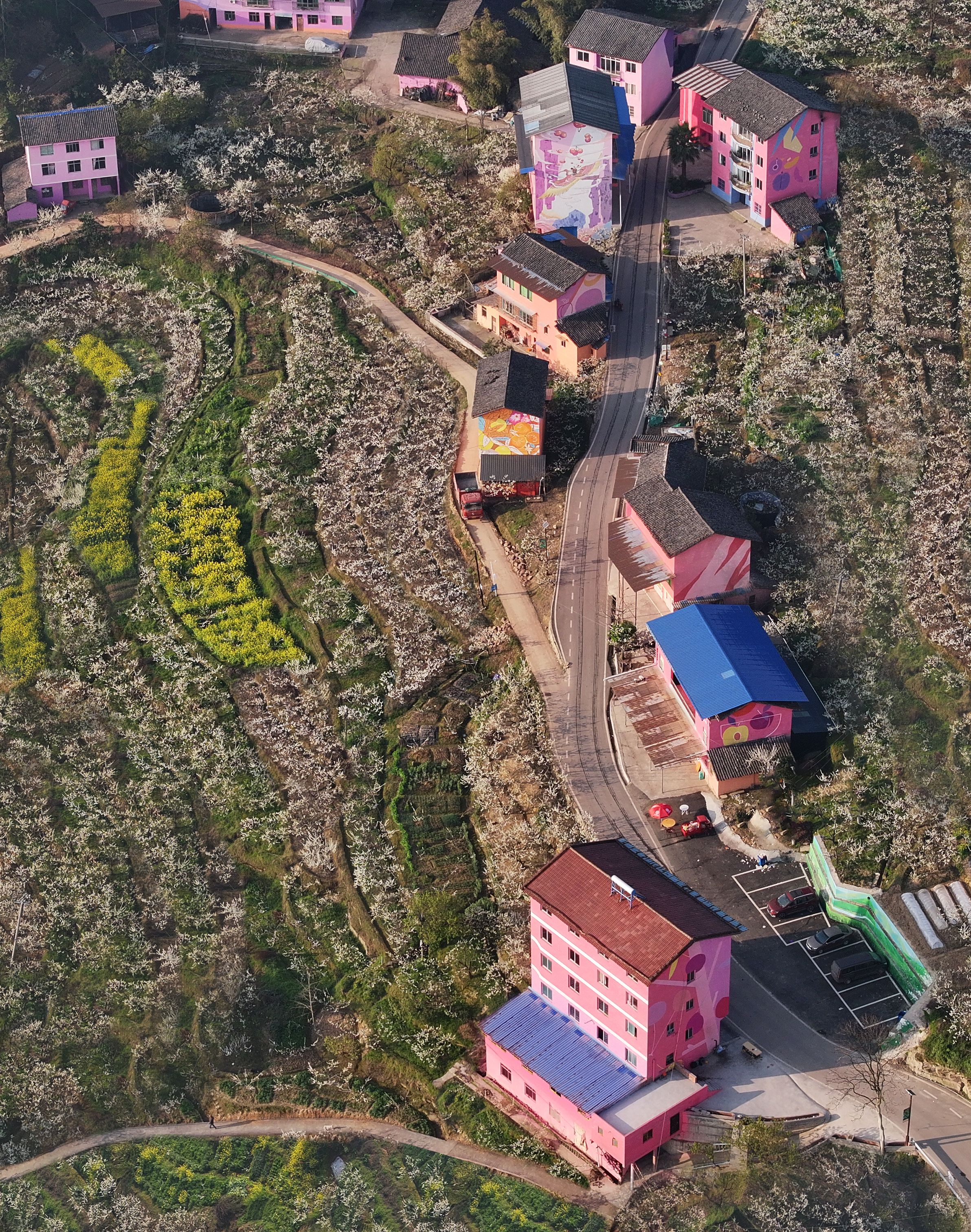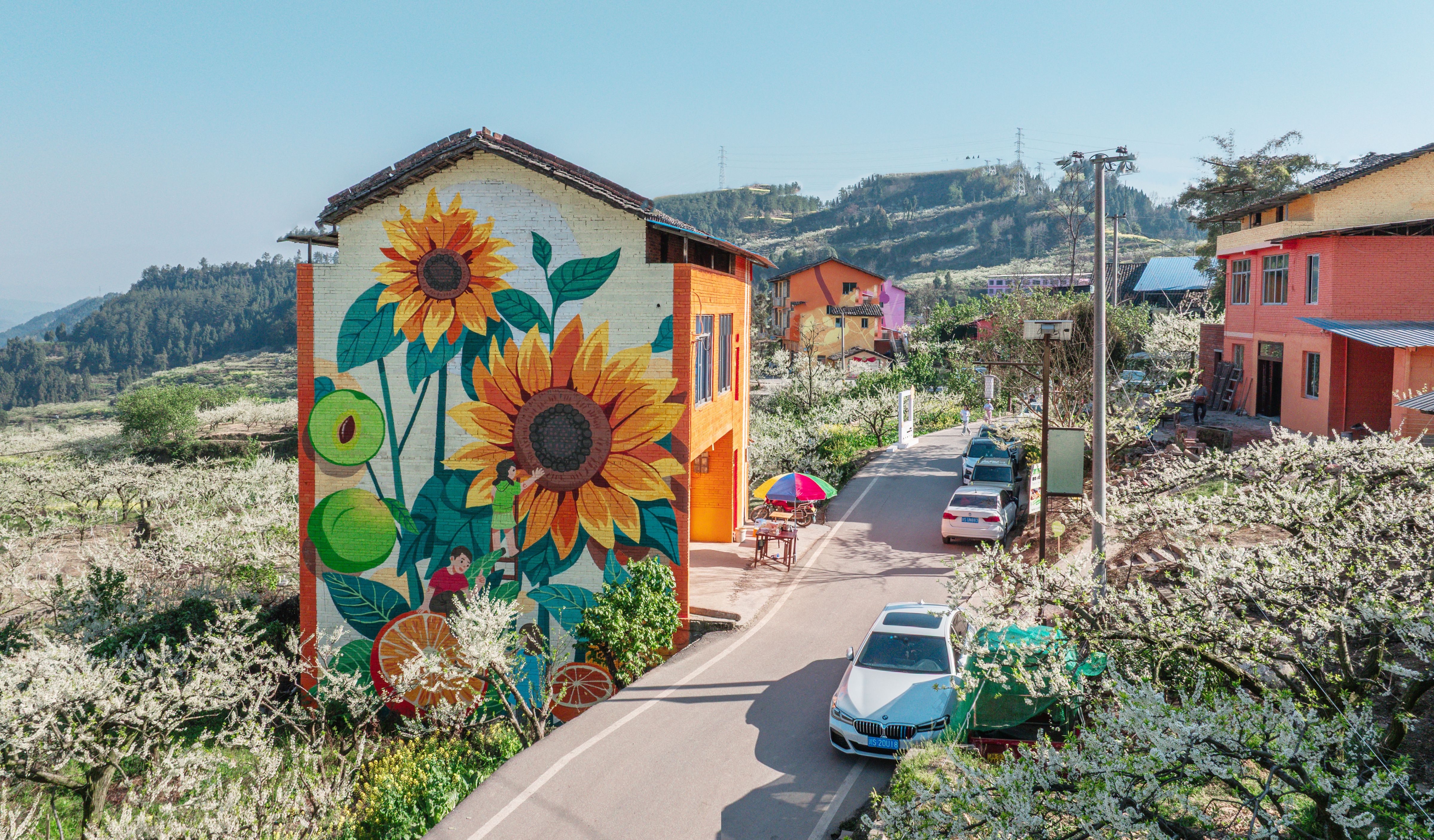 “中华李村”的蜕变,始于一场色彩与土地的对话。2023年春,四川美术学院的大巴车碾过中华李村的碎石路,带队老师扶着眼镜站在半山腰,望着错落的房屋和裸露的砖墙陷入沉思。“我们想试试马卡龙色系,让建筑与李花形成色彩对话。”他向围过来的村民解释,换来几句嘟囔,“花里胡哨的,能有白墙顺眼?”