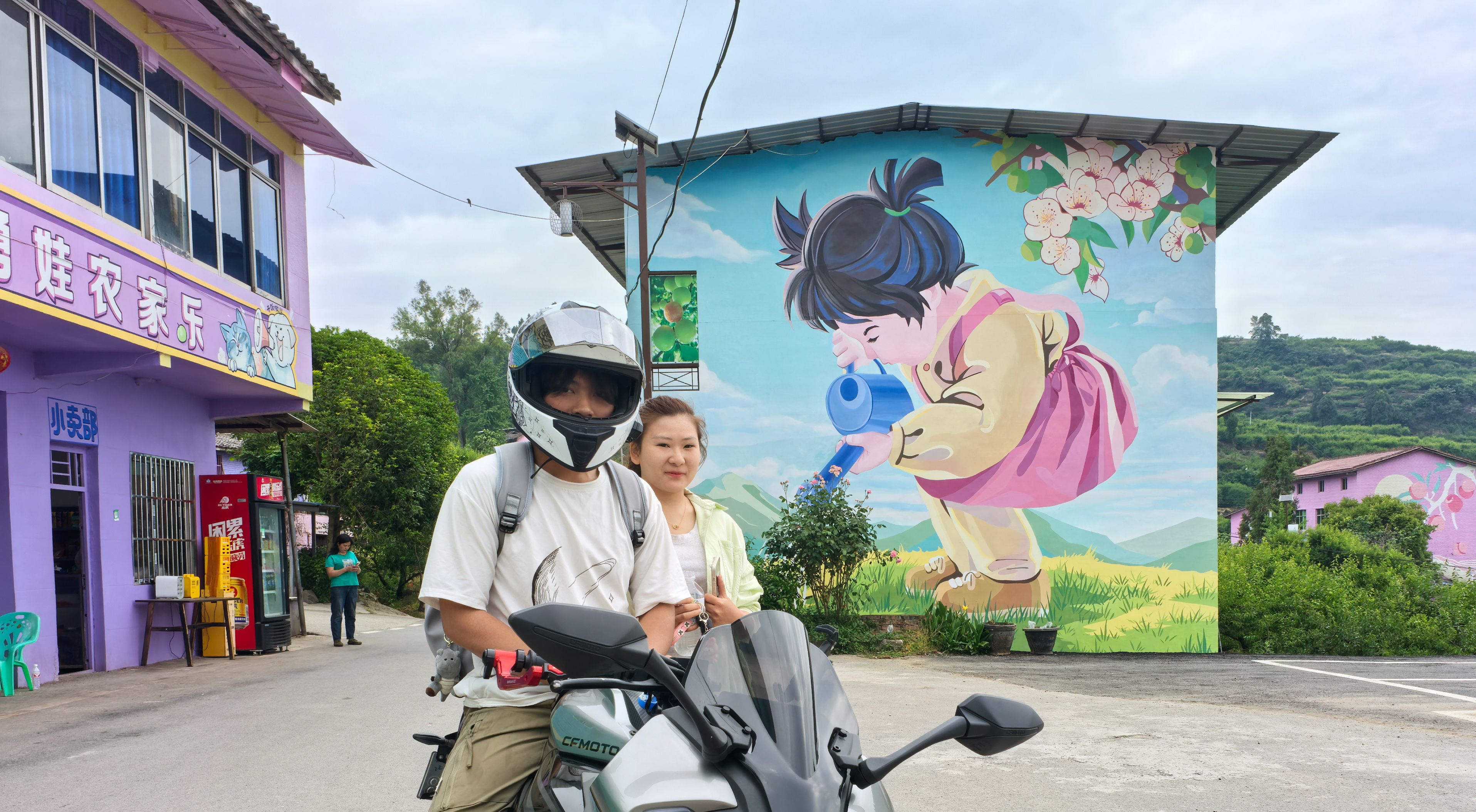 22岁的向宏洲骑着摩托车,载着一位眼神灵动的女生,风尘仆仆地停在了彩绘墙前。向宏洲在达城一家汽车4S店工作,这次,他特意避开周末,和心动女生从南城升华广场骑了一个小时的车来到“中华李村”。“朋友推荐我们过来的,说这里拍照很出片。”他摘下头盔,擦了擦额头上的汗,笑着说。女生微微低着头,眼里藏着期待。