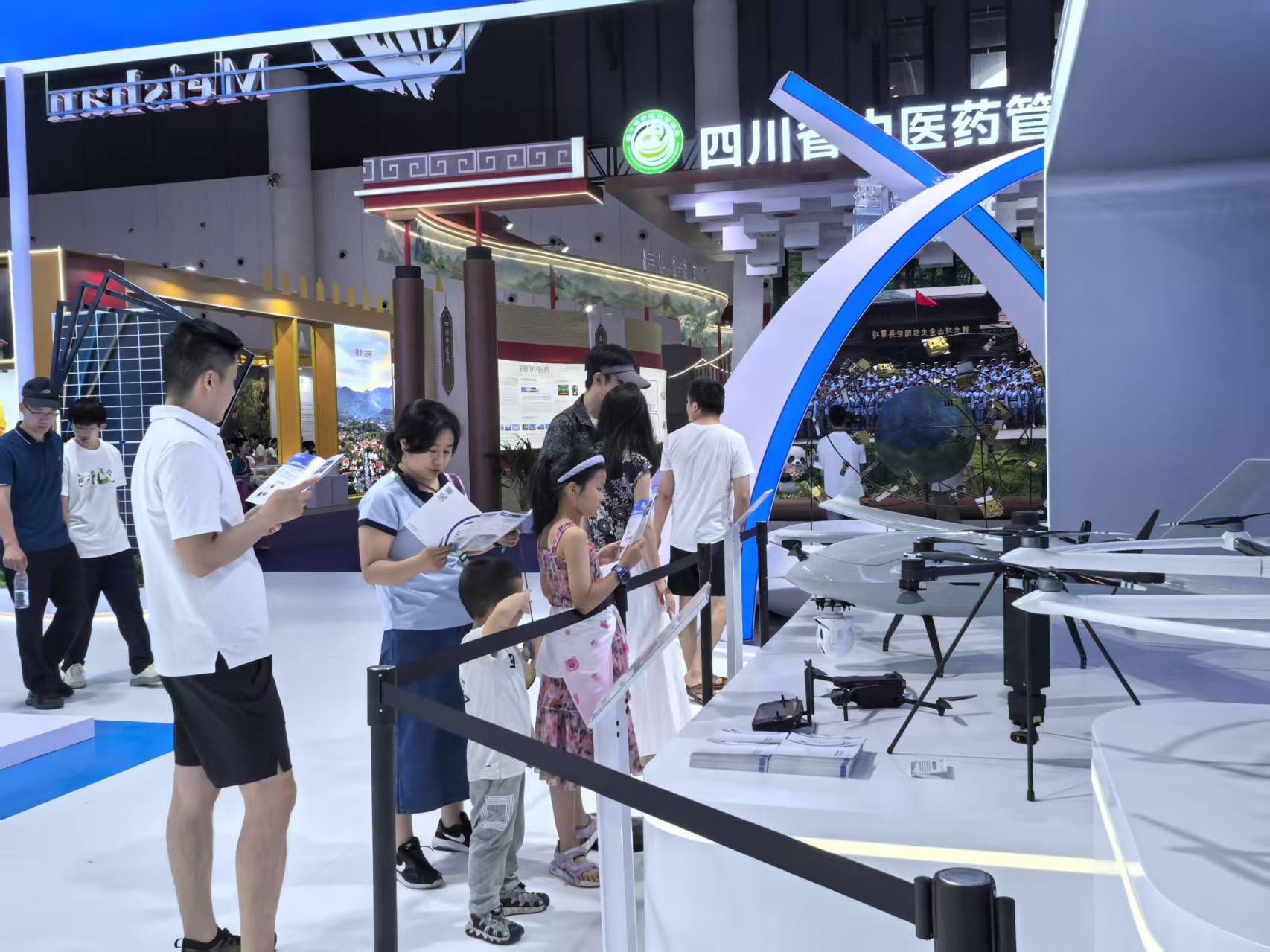 在眉山馆展区一侧,陈列着微型无人机、多旋翼无人机、垂直起降固定翼无人机等各类无人机产品。它们均由丹棱县四川睿宥智能装备有限公司生产。“公司2023年来到丹棱,目前拥有2个大型自有无人机基地和1个大型飞行测试场地,集研发、组装、生产、测试为一体。垂直起降固定翼无人机是公司生产的‘明星产品’,它结合了多旋翼和固定翼的特点,有效负荷最大能达到50公斤。”该公司商务经理付璇说。今年,公司在丹棱拓展了生产线,准备扩大产能并为今后发展载人飞行器做准备。