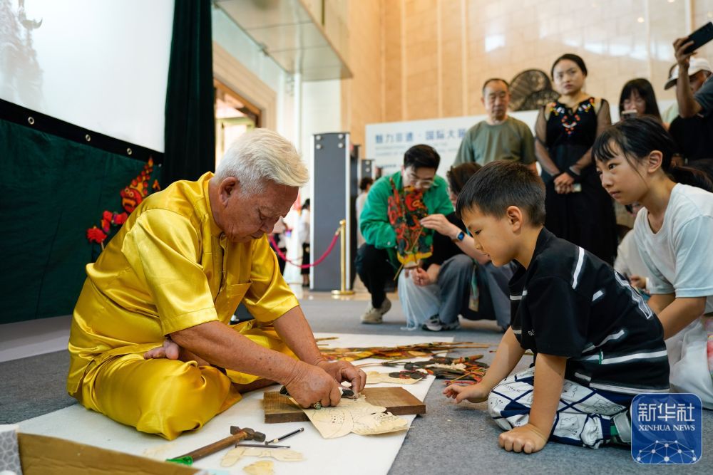 5月28日,在成都国际非遗节主宾国马来西亚展区,小朋友观看手艺人制作马来西亚皮影。