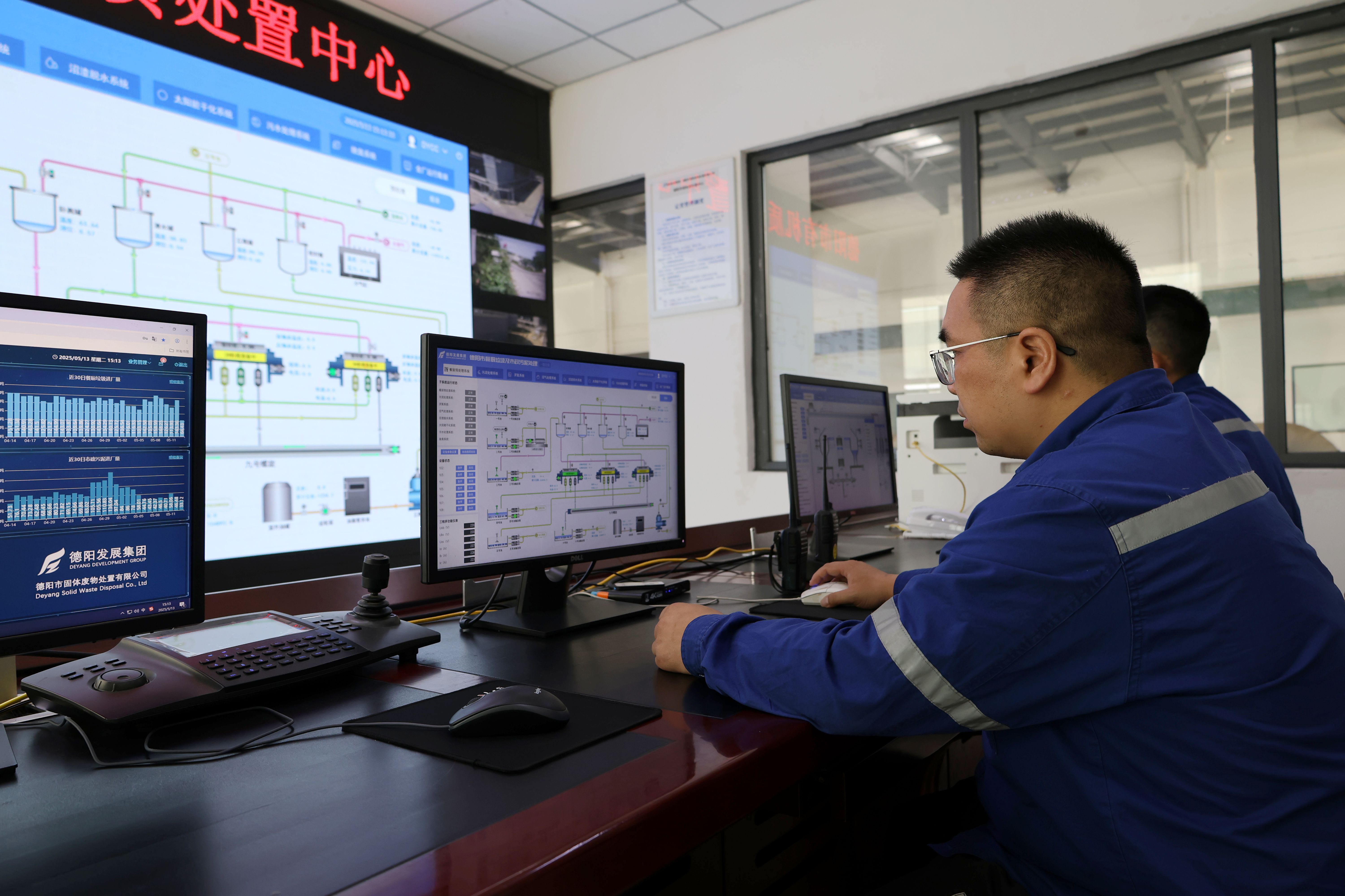 发电的原料就来自德阳市区的厨余垃圾。每天,垃圾清运车都会穿梭在德阳市区的大街小巷,准时到达餐厅、食堂厨房外,工作人员迅速将装满厨余垃圾的垃圾桶推到车边。随着一套行云流水般的自动化操作,一桶桶厨余垃圾进入清运车罐内,随即被运往位于德阳市旌阳区和新镇永兴村的有机质处置中心。总控室系统犹如该中心的“智慧大脑”,大屏幕上实时展示着各个子系统、设备运行状态和数据等,4名工作人员即可完成德阳主城区厨余垃圾全流程的转化处置,实现厨余垃圾日产日清。