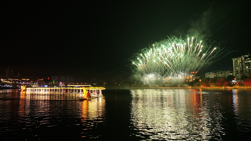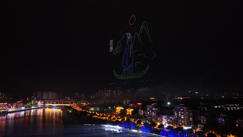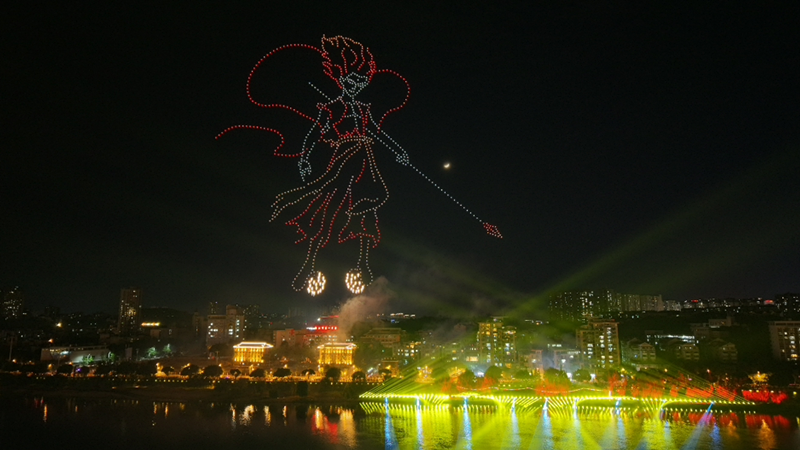 天为幕,水为台,晚上8时许,甜城湖畔灯光璀璨,夜色撩人。随着两岸烟花率先“炸场”,光影盛宴拉开帷幕。夜空中,千架无人机极速变幻阵型,拼绘出龙舟、哪吒等动态图景。舞台之上,150米低空冷焰瀑布与高空焰火交相辉映,尽展“夜内江”的迷人风采。