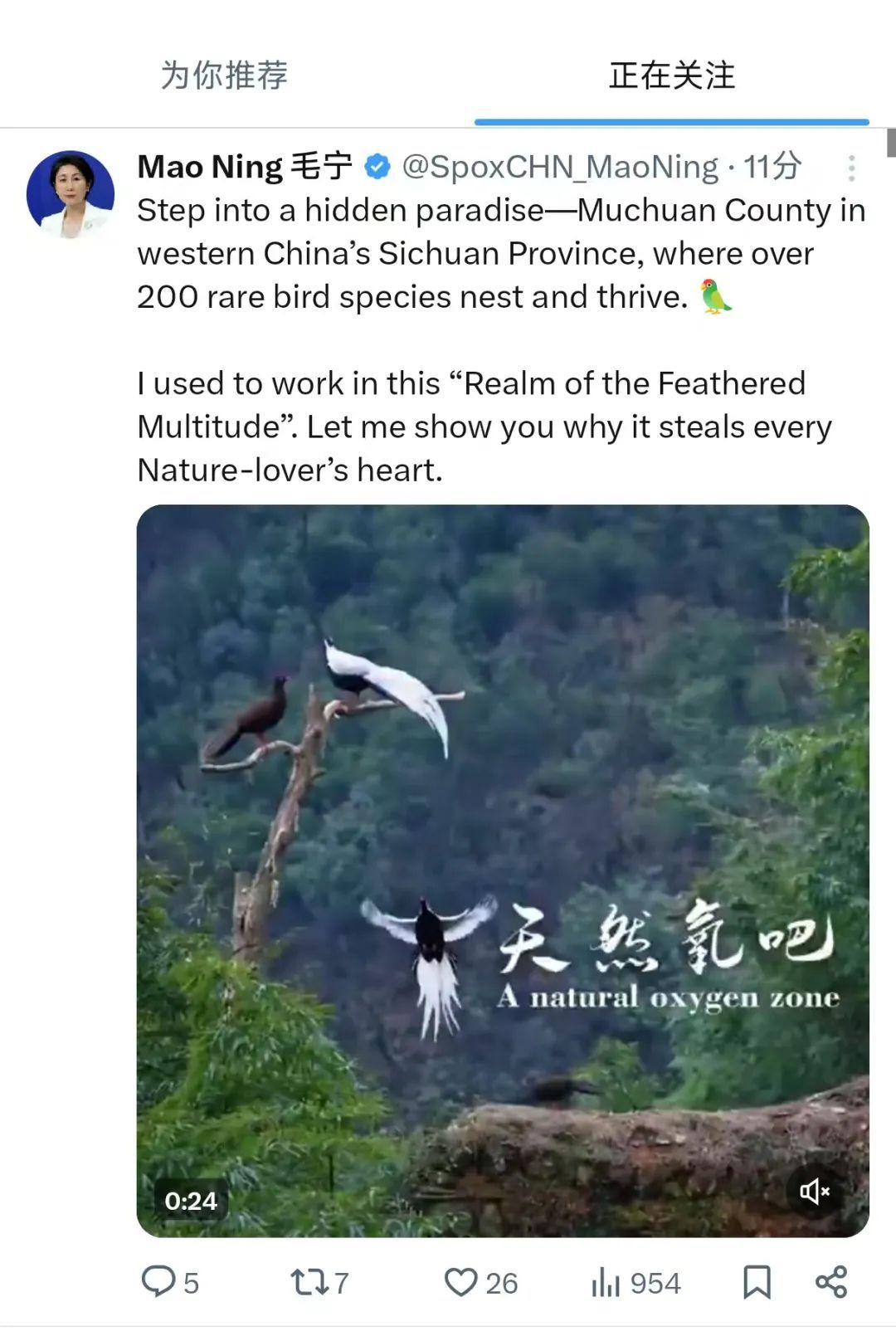5月30日,外交部发言人毛宁在社交媒体上向全球热情推介乐山沐川生态美景,盛赞其“天然氧吧”和“观鸟天堂”,自然风景令人着迷。毛宁在推文中写道:“我曾在这个‘羽族之地’工作过,让我带你领略它为何能俘获每一位自然爱好者的芳心”。这一推介迅速引发海内外网友热烈反响,众多网友纷纷留言,为沐川的生态美景“打call”,沐川的珍稀鸟类和壮美景观再次成为全球关注的焦点。