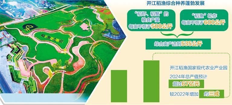 通过一二三产业融合发展,开江稻渔国家现代农业产业园2024年总产值预计超67亿元,较2022年增加约三成,主导产业产值可达48亿元,园区内农民人均可支配收入预计约3.4万元。