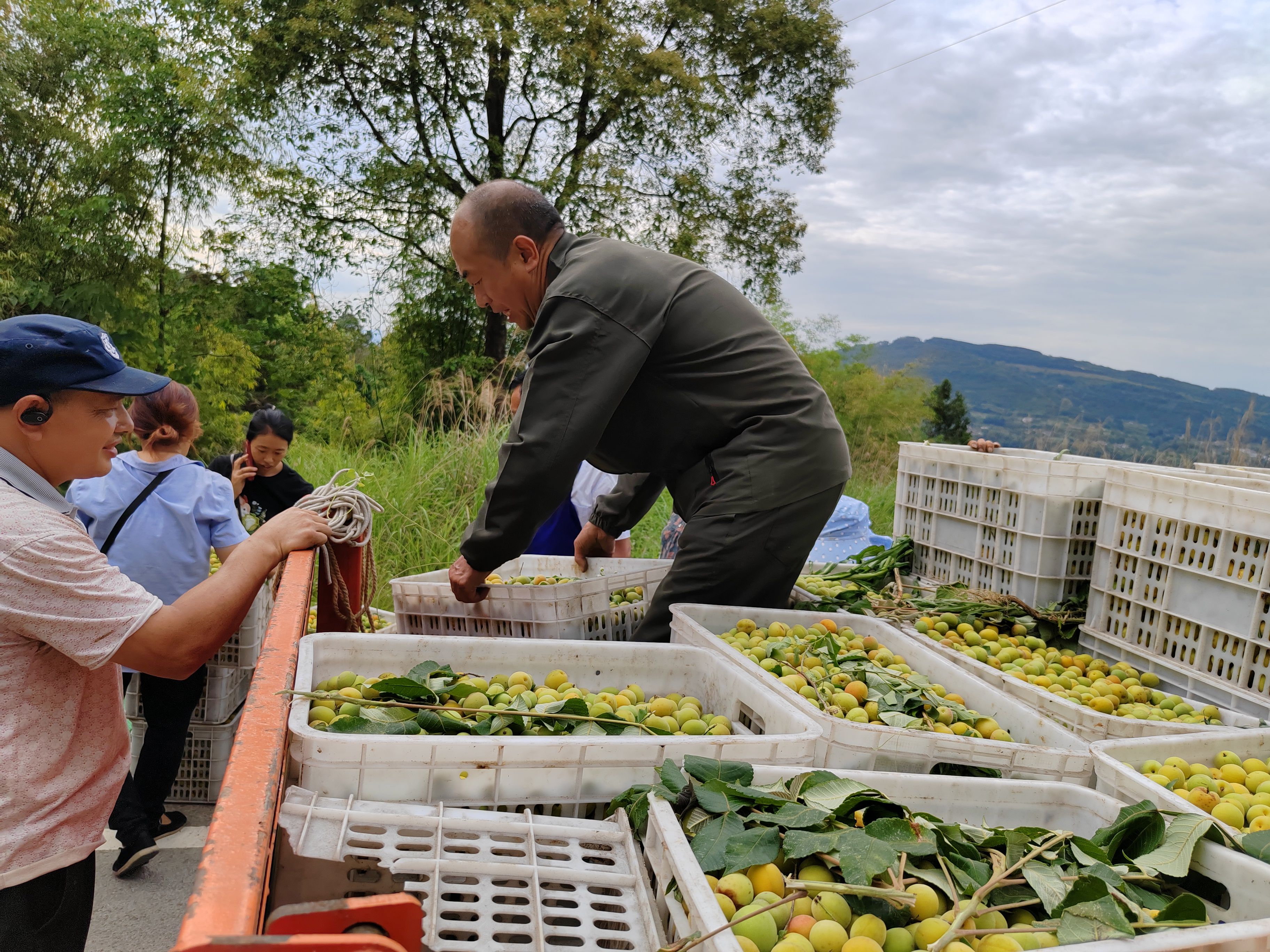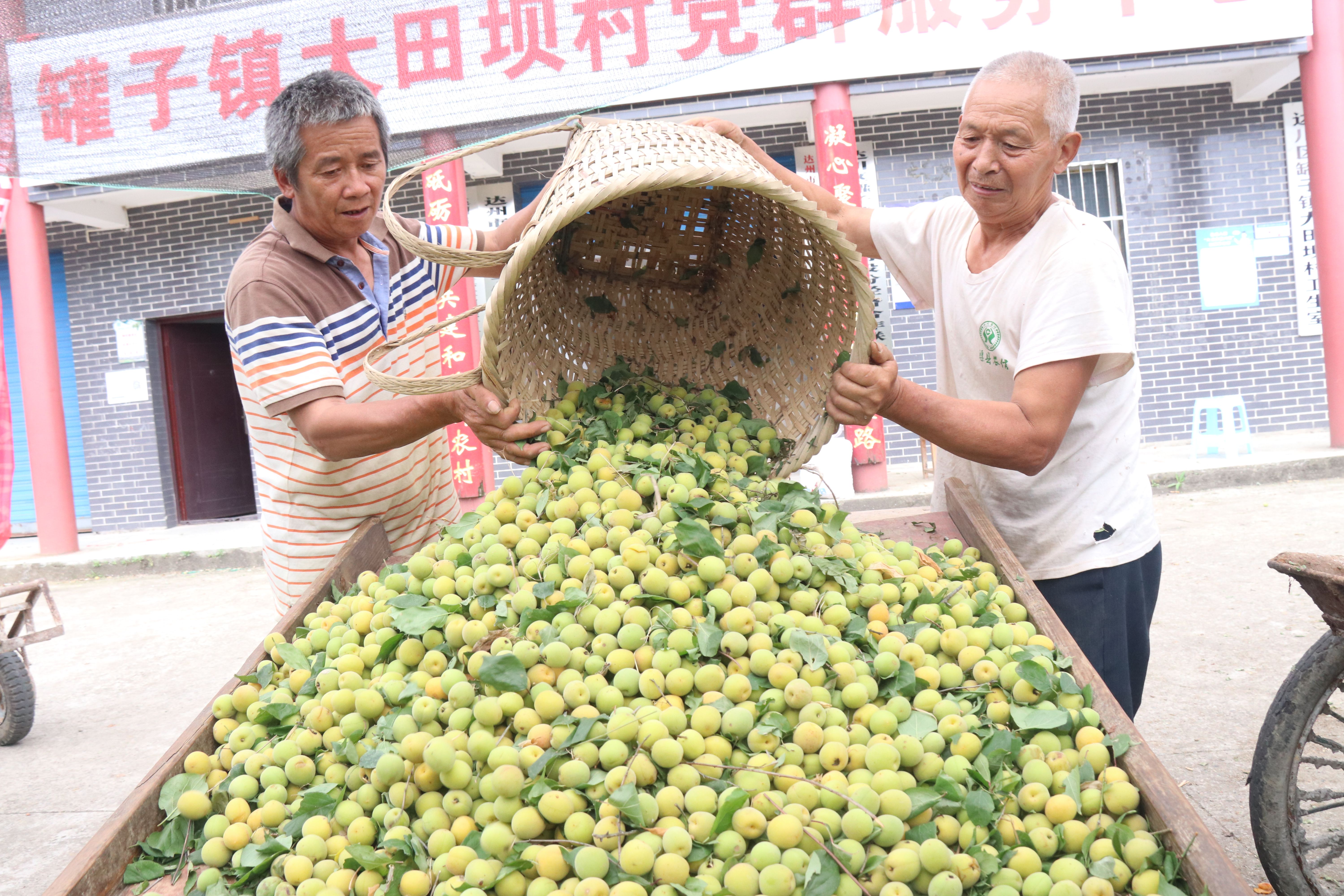 达川区罐子镇也是乌梅的核心产地,大田坝村是该镇种植面积最大的村。最近几天,村民们都将采收的乌梅运至大田坝村村委会门口。记者在大田坝村村委会看到,现场堆放了几百袋乌梅,门口的公路上停放着两辆大货车。分拣、过秤、装车……现场一派繁忙。“今年联系好了一名云南的收购商,定向收购我们村600吨乌梅。”大田坝村党总支书记潘传芳介绍,该村现种植乌梅3000余亩,预计今年采收600余吨。