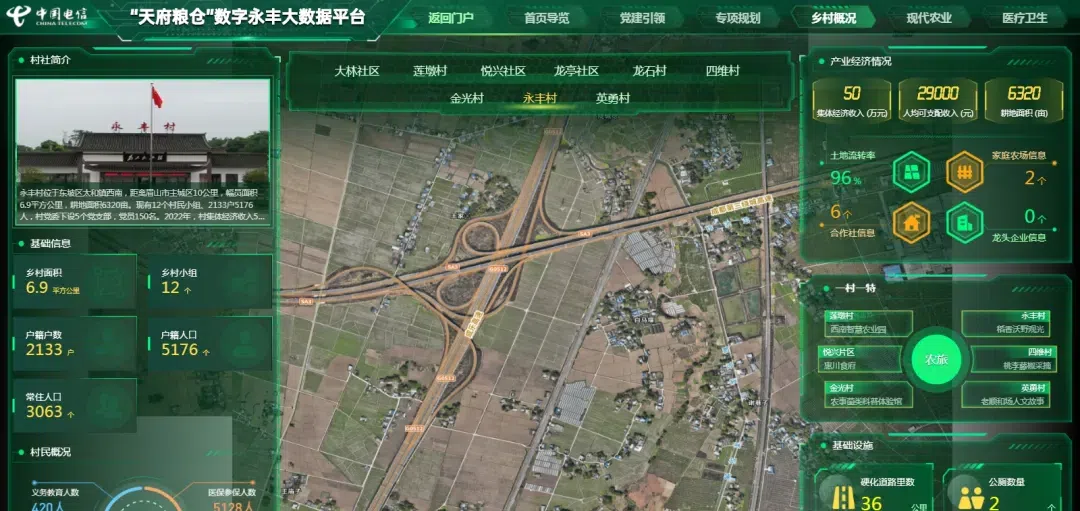 如今,永丰村辐射带动整个永丰片区,实现水稻亩产800公斤,最高达900多公斤,机械化率达98%。四川电信结合人工智能、新能源太阳能、5G物联网技术等科技手段,量身为永丰村打造天府粮仓数字永丰大数据平台,用科技引领农业新潮流,用数字化春风打造“天府粮仓”好“丰”景。