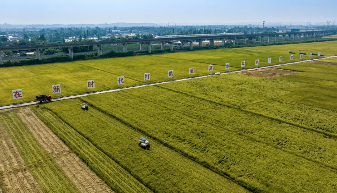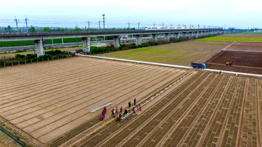 几天后,村民们把装着我的育秧盘从车上取下来,放在履带传送机上,后方的村民便开始取盘摆盘,没过多久,我们就铺满了田块。高铁从旁飞速驶过,永丰村大地穿上了一件绿意盎然的春衫,一幅“天府粮仓”的美丽画卷缓缓拉开。