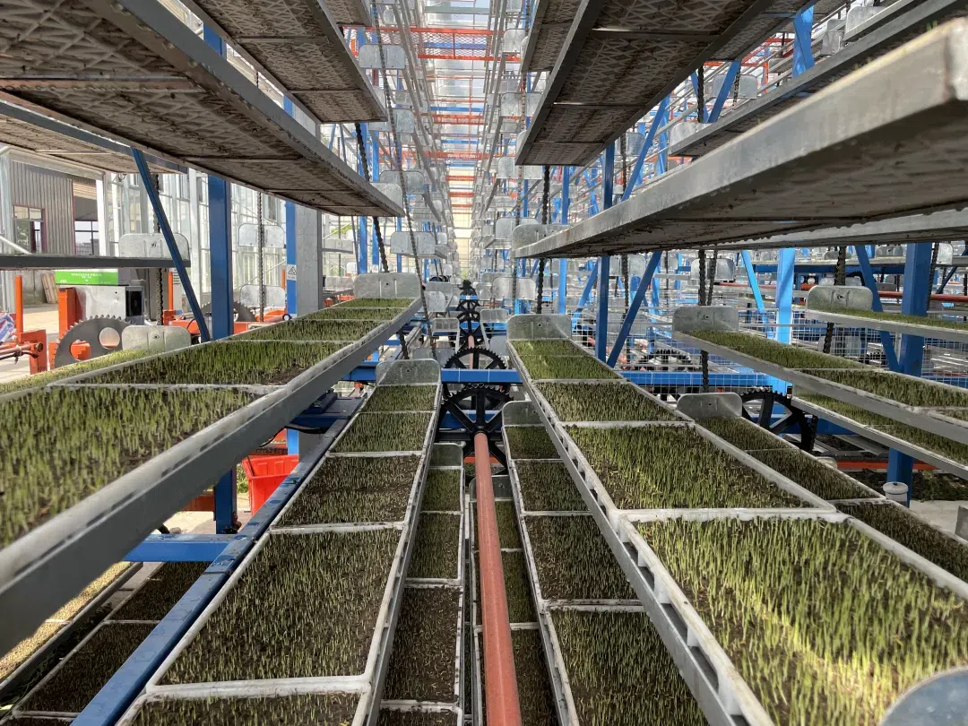 我还看到了1664平方米的巨大玻璃温室,里面摆满了育秧苗床设备和智能补光、灌溉、施肥系统,并配备播种流水线、水肥一体化、暗化催芽、粉土机等设备。在这里,我和小伙伴们可以在恒温环境下,舒舒服服地坐着“电梯”,享受补光和喷水服务,仅仅花了20天,我们就长大啦。