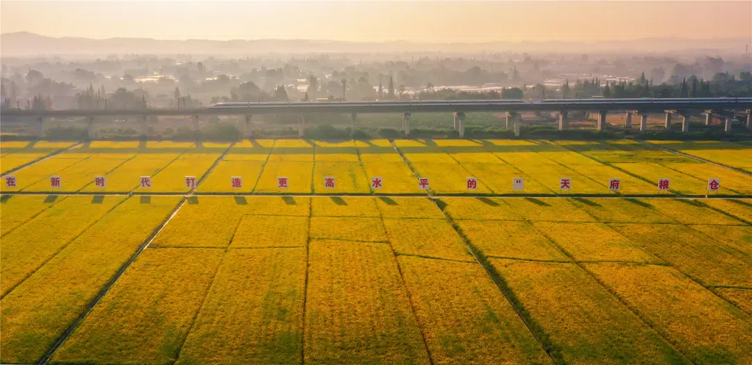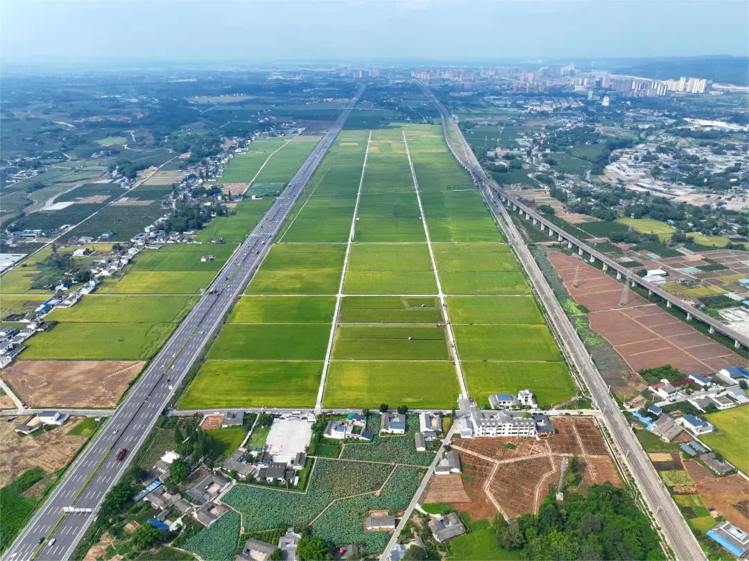 六月的永丰村,成绵乐城际列车划过高架桥时,乘客们总会不约而同举起手机。窗外,千亩高标准农田正铺展着令人屏息的画卷。叶片在艳阳下泛着油亮的墨绿,田块如棋盘般规整,灌排渠系反射的银光将大地分割成几何色块,与远处白墙黛瓦的村落构成一幅关于“天府粮仓”的现代田园主义作品。