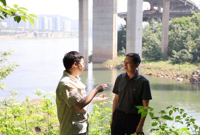 在南广河(陈塘关段)沿江,罗兴华(右一)和叙州区南广镇水利工作员进行交流 罗友莉 摄