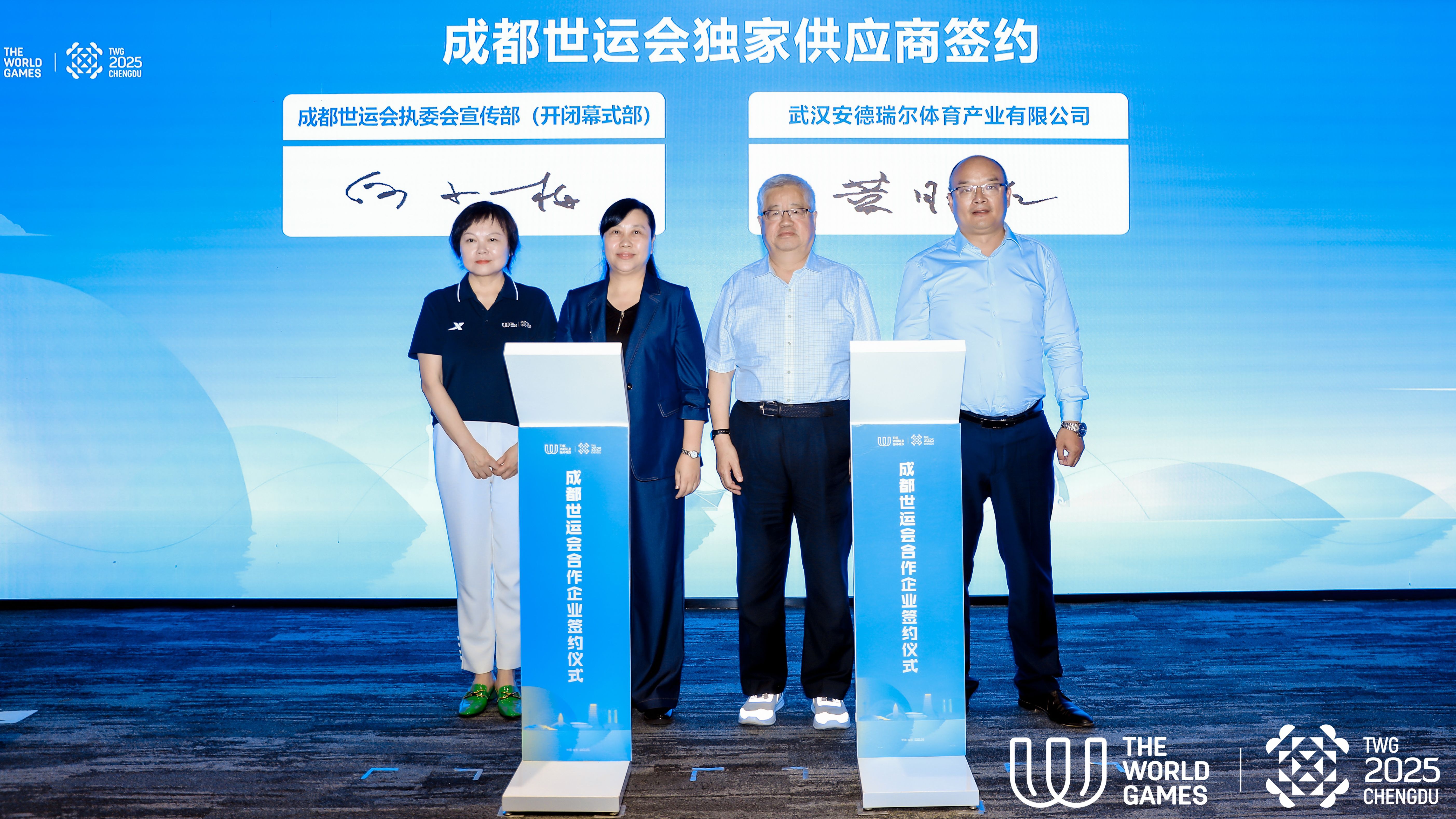 活动上,还举行了世运会合作企业签约仪式。成都世运会执委会宣传部(开闭幕式部)与武汉安德瑞尔体育产业有限公司签署赞助合作协议,安德瑞尔正式成为第12届世界运动会官方独家供应商,作为工艺设施类的独家合作伙伴,将为成都世运会提供更智能化的设施搭建保障服务。