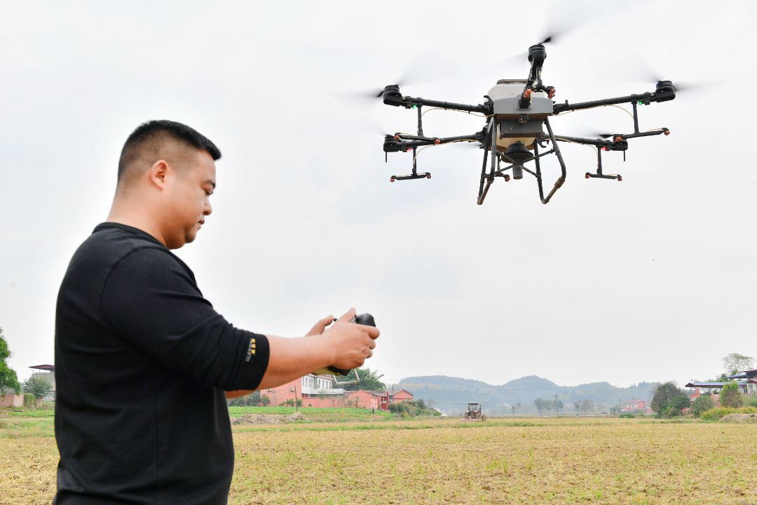种植户正在利用无人机进行小麦播种,提高农业种植效率。眉山融媒记者 廖波 摄