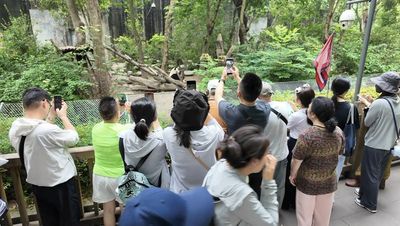 在星星产房区域,记者见到了金豆。金豆不仅继承了妈妈的神态,也继承了妈妈爱爬树的特性。一同生活在同一区域里的四只大熊猫幼崽中,金豆最好认:“你看每次挂在树上的,十次有九次都是它。”最惊险的一次,金豆爬到树顶不肯下来,饲养员喊了3小时才“劝回”。如今,为防它爬得太高,工作人员在树干上包裹了防护材料。