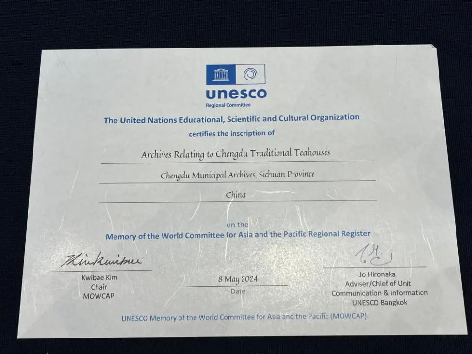 2024年5月8日,联合国教科文组织世界记忆项目亚太地区委员会第十次全体会议(MOWCAP)在蒙古国首都乌兰巴托落下帷幕,成都市档案馆馆藏“成都老茶馆档案”成功入选《世界记忆亚太地区名录》。这是成都档案继2023年1月第一次成功入选《中国档案文献遗产名录》后的又一重大突破。