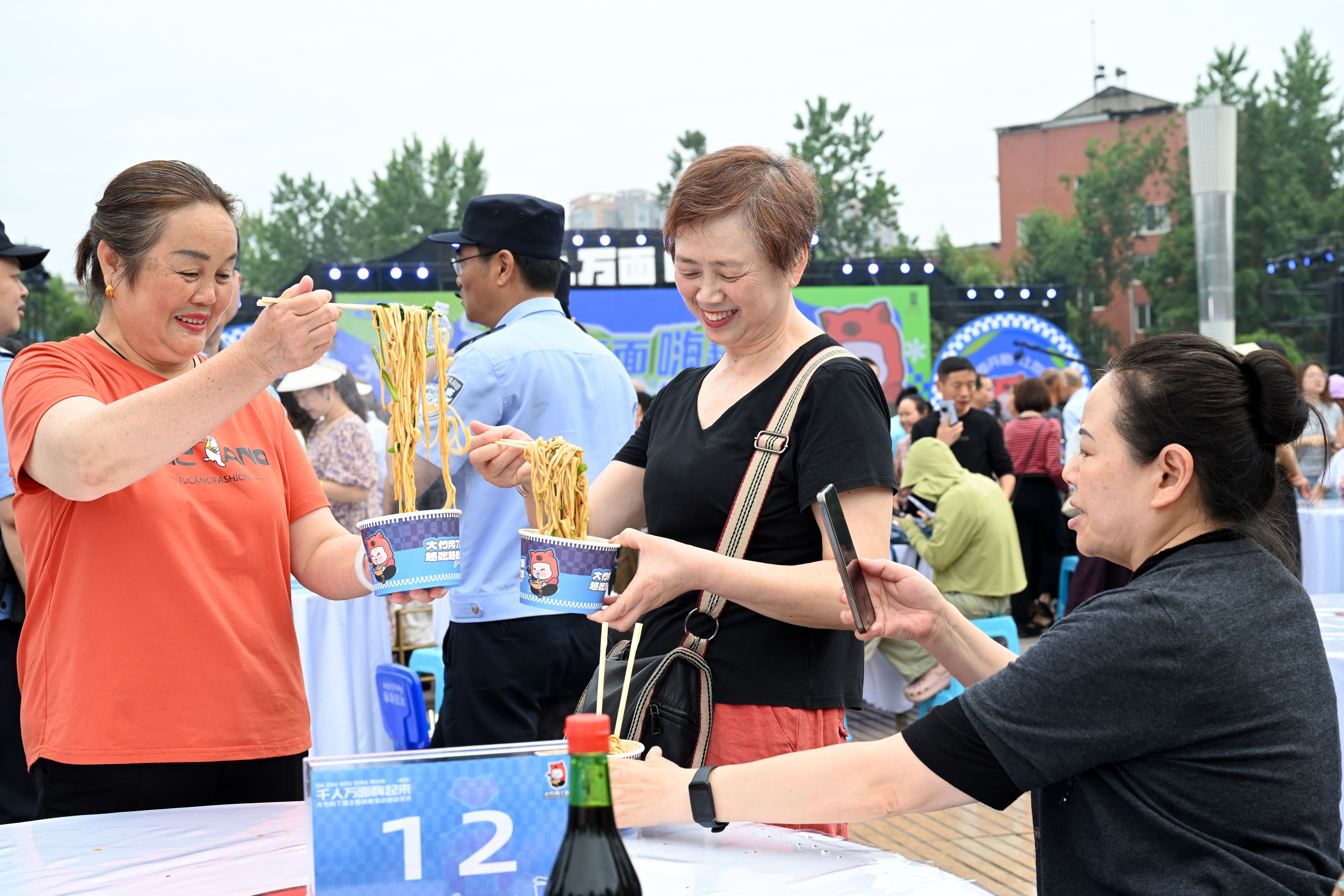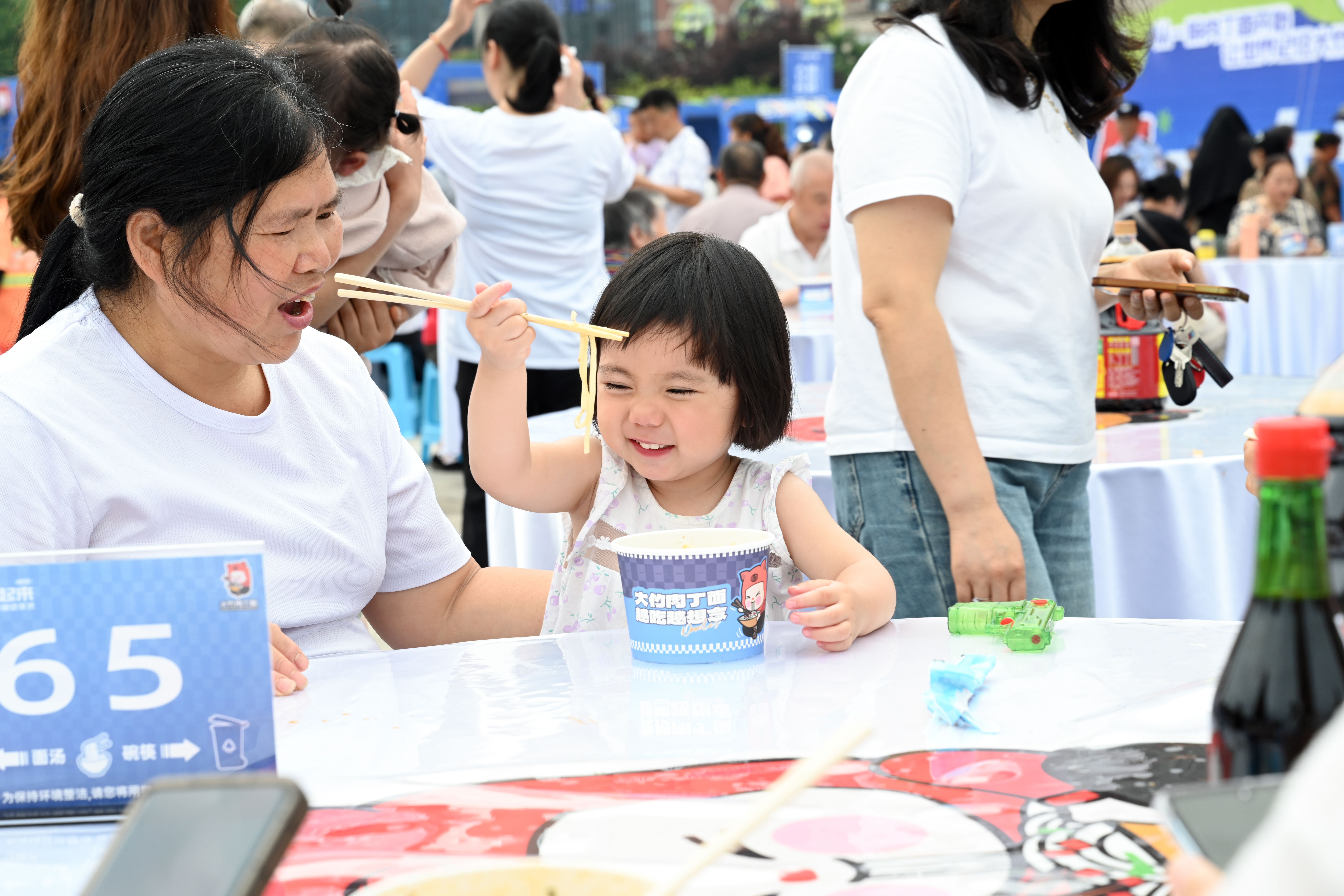除了品尝美味的肉丁面,现场还设置了丰富多样的互动环节。市民和游客纷纷与吉祥物“面宝宝”合影留念,在兑换处换取“面宝宝”相关纪念品;消费抽大奖、创意拍照墙、乐队演出、灯光秀等活动轮番上演,为游客带来了全方位的沉浸式体验。
