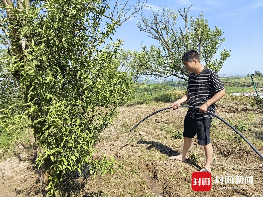 6月10日,内江市市中区朝阳镇铧匠冲村1组一座山上,55岁的曹红春正忙着和工人一起给果树浇水。连日来炙烤,川红橘的叶片向里蜷缩,少了些生机。