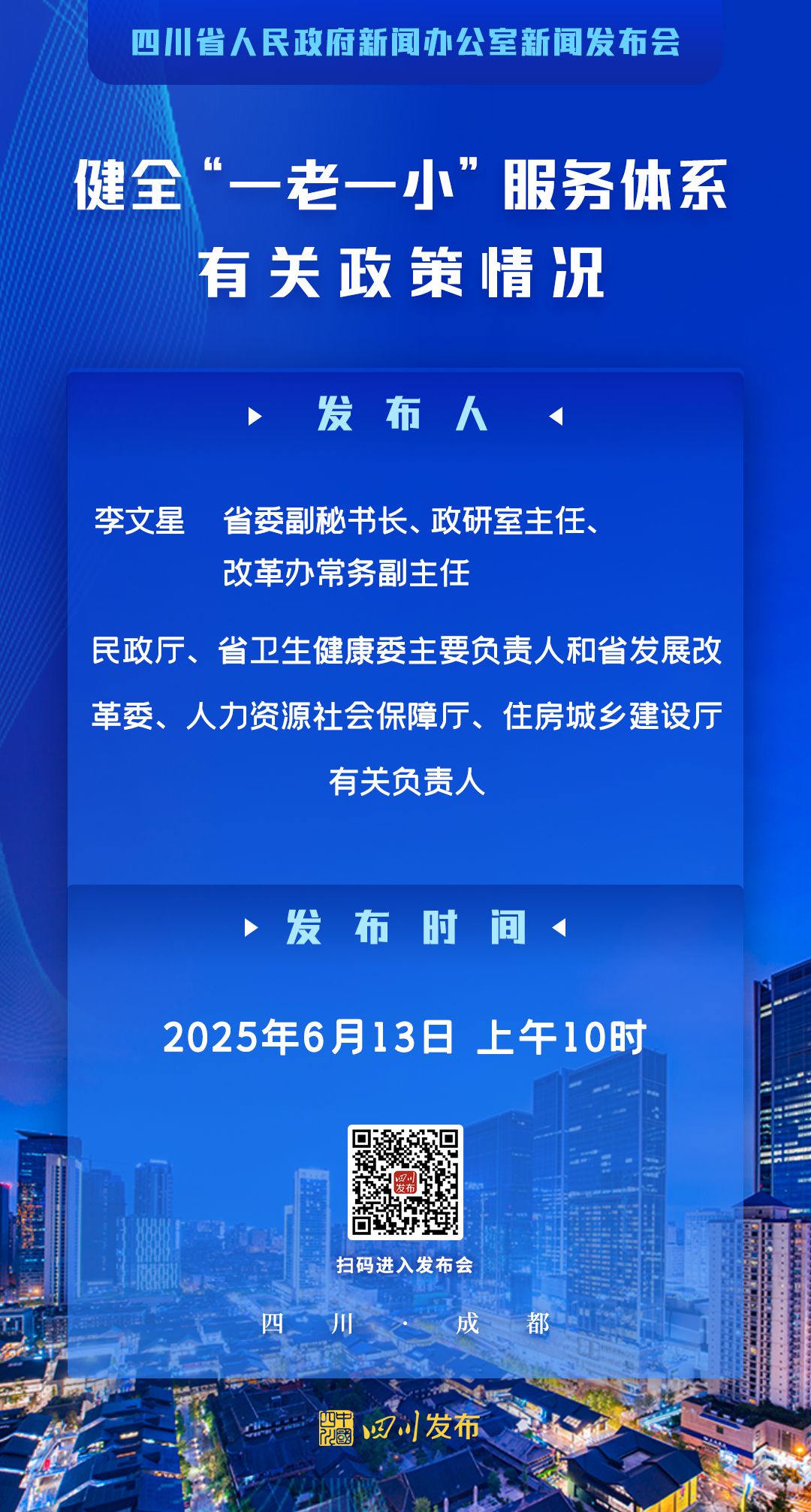 2025年6月13日(星期五)10:00,省政府新闻办将在四川新闻发布厅举行新闻发布会,请省委副秘书长、政研室主任、改革办常务副主任李文星,民政厅、省卫生健康委主要负责同志和省发展改革委、人力资源社会保障厅、住房城乡建设厅有关负责同志介绍健全“一老一小”服务体系有关政策情况,并答记者问。四川发布客户端将全程图文直播,敬请关注!