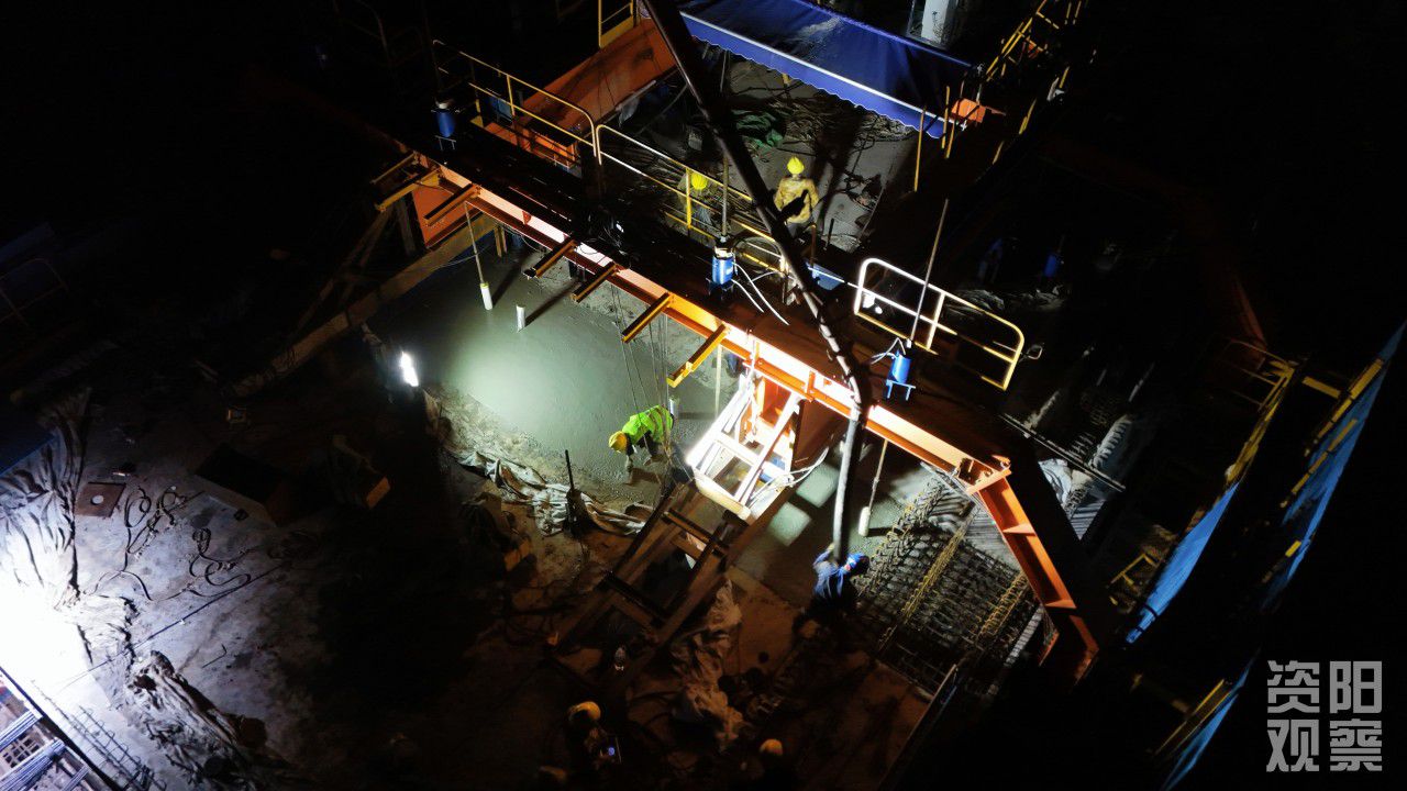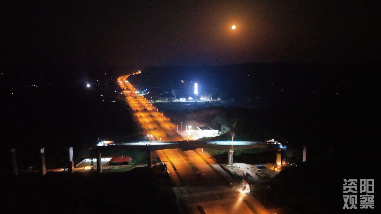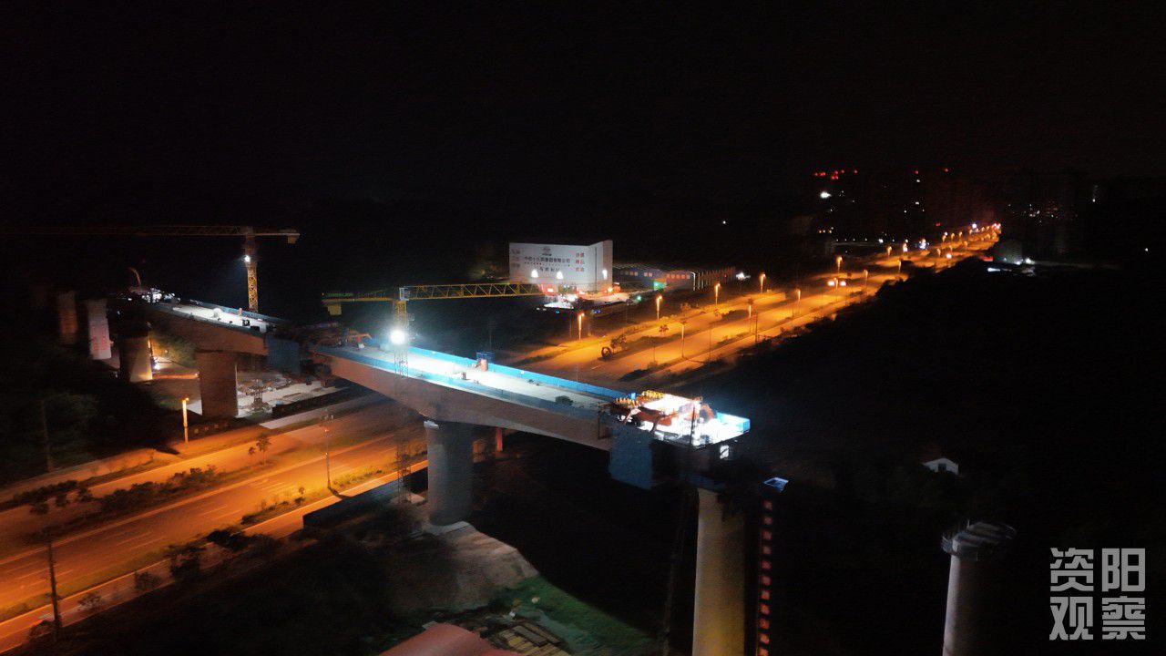 “现在我们正在利用智能造桥机进行边跨合龙支架,预计凌晨后浇筑完成。”中铁十九局成渝中线八标项目经理部技术员杨刚说。
