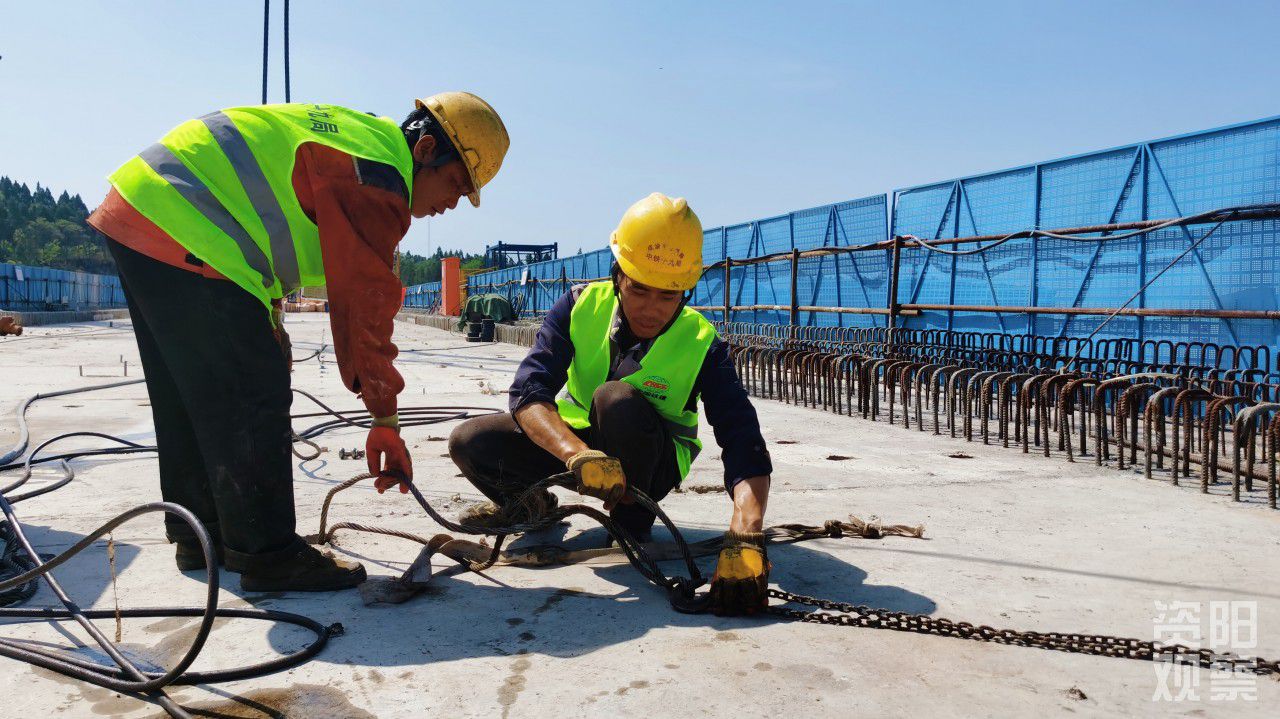 6月10日16时55分,资阳市气象台发布高温蓝色预警,预计未来三天资阳市最高气温可达39℃。此时,成渝中线高铁跨安岳大道特大桥的施工现场,室外温度已经达到35℃,20余名施工人员顶着烈日,在30多米高的桥面上开展大桥连续梁合龙前的预应力筋张拉作业。
