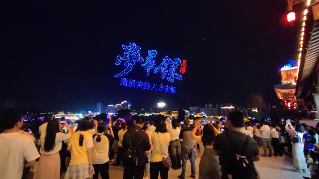 游客在梦华录街区观看无人机表演。(恩阳融媒供图)