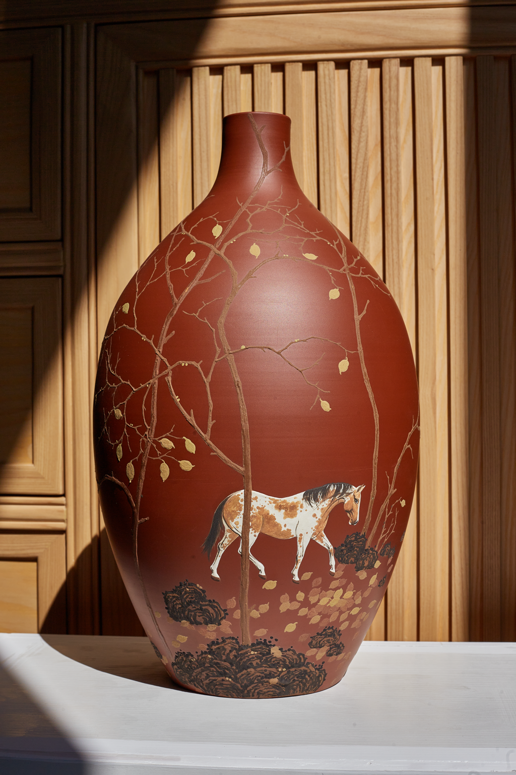 这份对传统技艺的坚守与创新,让丁己彩陶收获丰硕成果。在2023年第六届中国四大名陶(4+N)钦州展上,丁玉蝶的手绘花器《踏雪无痕》,凭借独特的荣州泥绘技法一举斩获金奖;2024年第七届中国四大名陶(4+N)建水展上,丁玉蝶的作品《龙马》凭借8块陶板的细腻彩绘,以工笔画的精湛技艺将骏马英姿展现得淋漓尽致,再夺金奖;今年6月,在第五届中国工艺美术博览会上,陶瓷镶器作品《牧马图/逸骏芳华图》更是摘得2025年“百鹤杯”工艺美术设计创新大赛百鹤奖,以非遗工艺与现代艺术的完美结合,赢得行业高度赞誉。