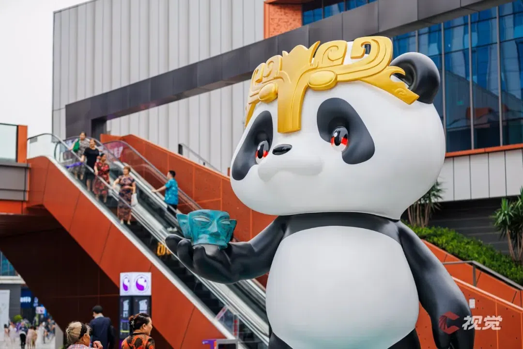 天府国际动漫城内戴有三星堆标志的熊猫雕塑 摄影/C视觉 袁义明