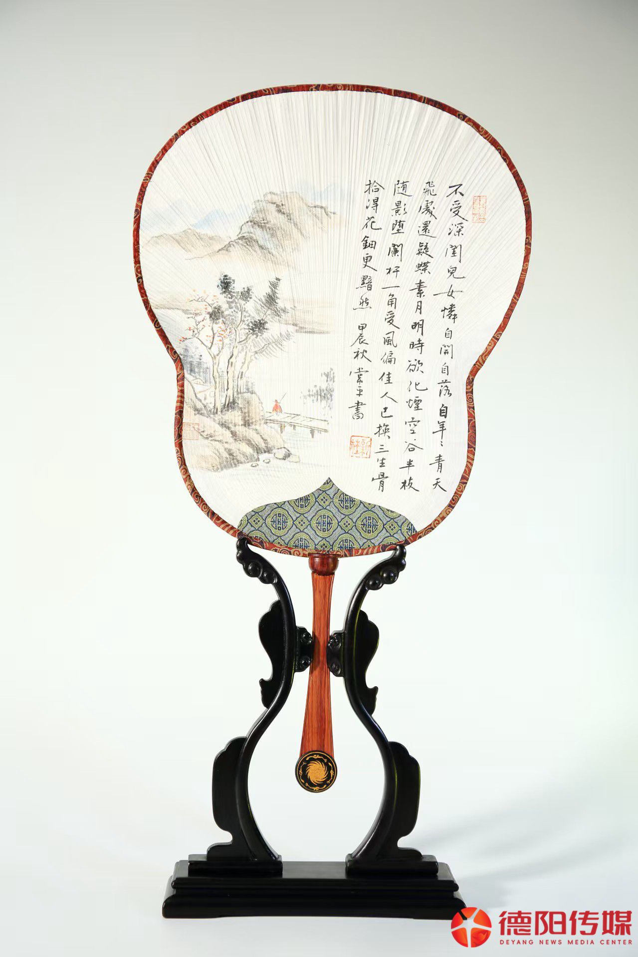 传统的德阳潮扇“以竹为骨,以绢为面,以文为墨,以画为魂”,经选竹、去竹青、劈丝、编织、排线、装裱等18道大工序、50余道小工序,耗时三四日方能完成制作,其繁复的工艺至今无法用机器代替。