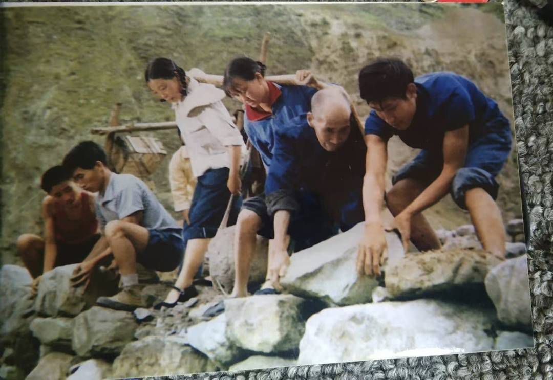 孙名山(右二)父子和当地群众一起干活。图据受访者