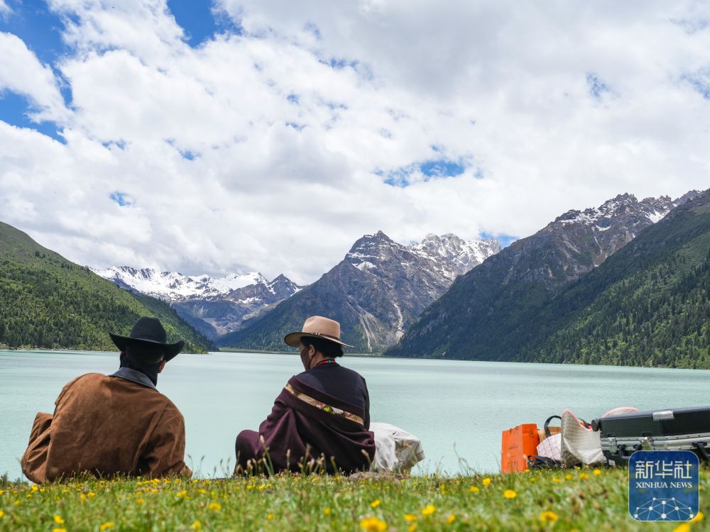 ↑6月21日,游客在玉龙拉措观光休闲。新华社记者 王曦 摄