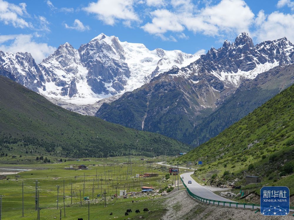 ↑这是6月21日拍摄的雀儿山主峰(左)和国道317线。新华社记者 王曦 摄