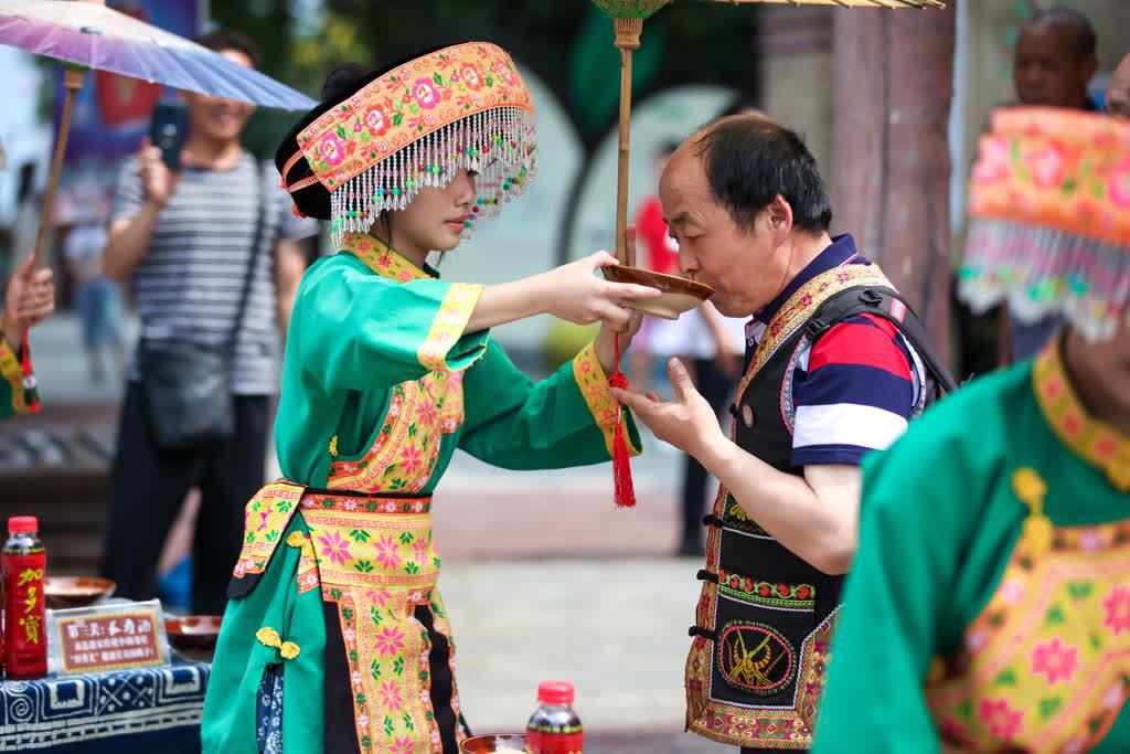 这是一种热情好客的风情。台上精彩节目不断,台下米酒倒满碗,在阵阵悠扬的芦笙中,苗家祝酒歌唱起来,苗家阿妹纷纷端起手中的大碗,让远道而来的客人喝上一口香甜的米酒,氛围热情、隆重、团结、和谐。