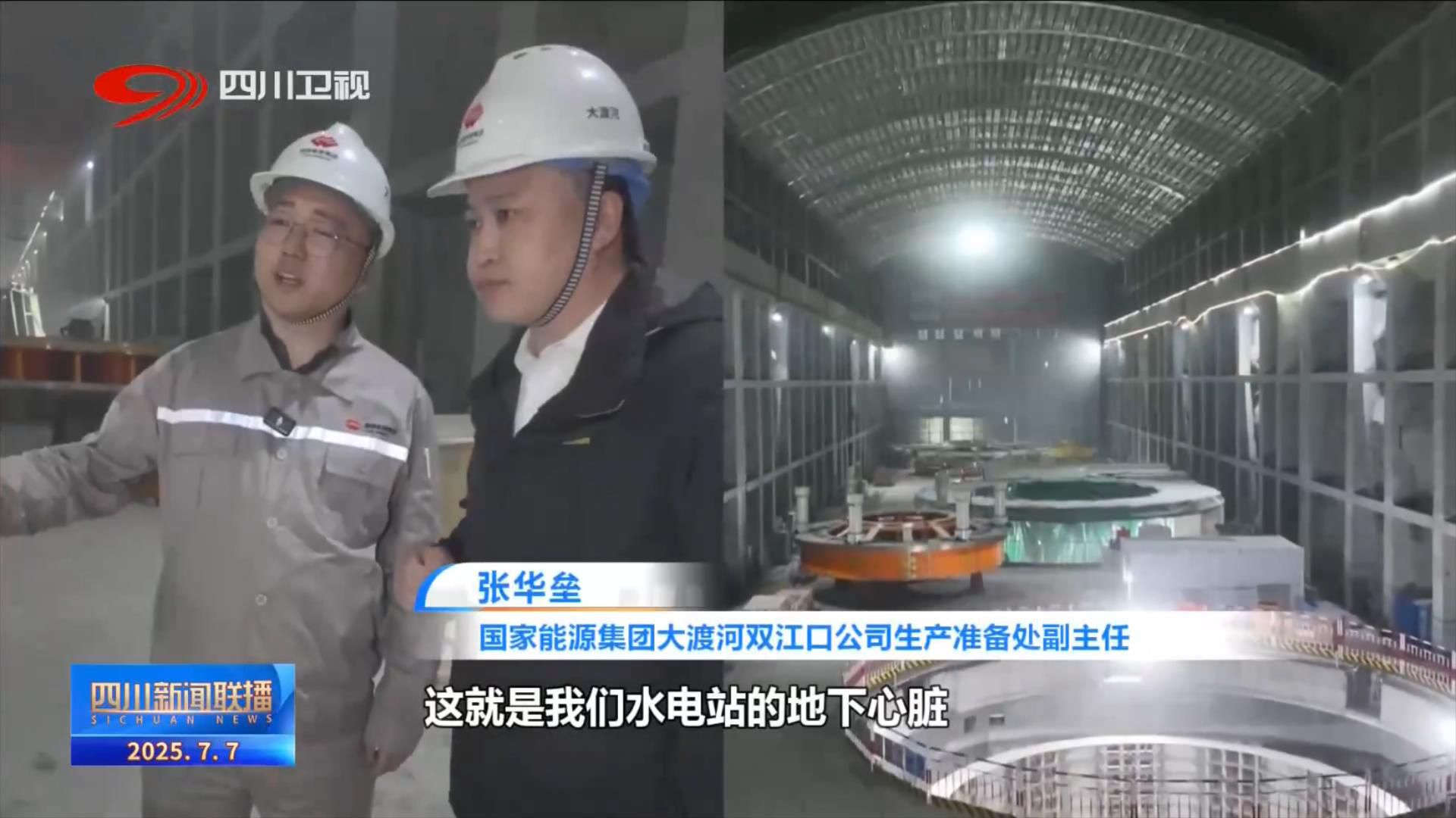 国家能源集团大渡河双江口公司生产准备处副主任 张华垒:这就是我们水电站的地下心脏,水轮发电机组。红色这部分就是我们的主轴,它的上面是发电机,下面是水轮机。库区的水经过水轮机以后,将水的动能和势能转化为机械能,再通过定转子转化为电能。预计首批机组调试完是12月,大概12月20号左右能发电。