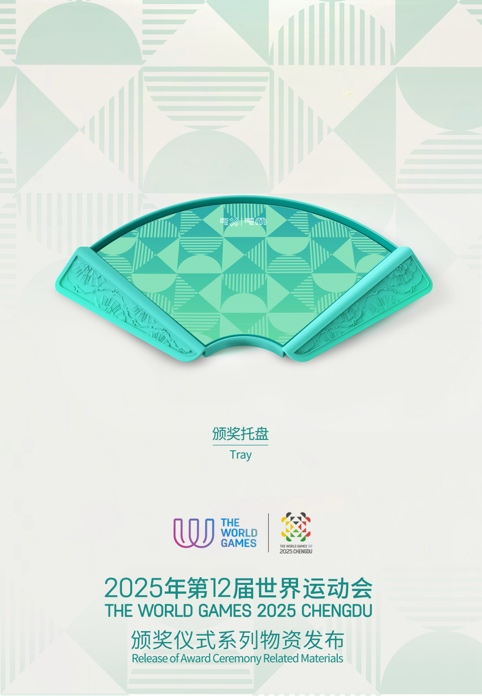 颁奖托盘整体为圆润流畅的扇形,握柄处浮雕太阳神鸟振翅纹与芙蓉盛放图,再现古蜀金沙文明与“蓉城”千年花事。托盘采用蓝绿渐变釉色,如青城叠翠;内衬防滑绒布印世运几何纹,沿袭大运会模具的梯形握柄兼顾防滑与人体工学。