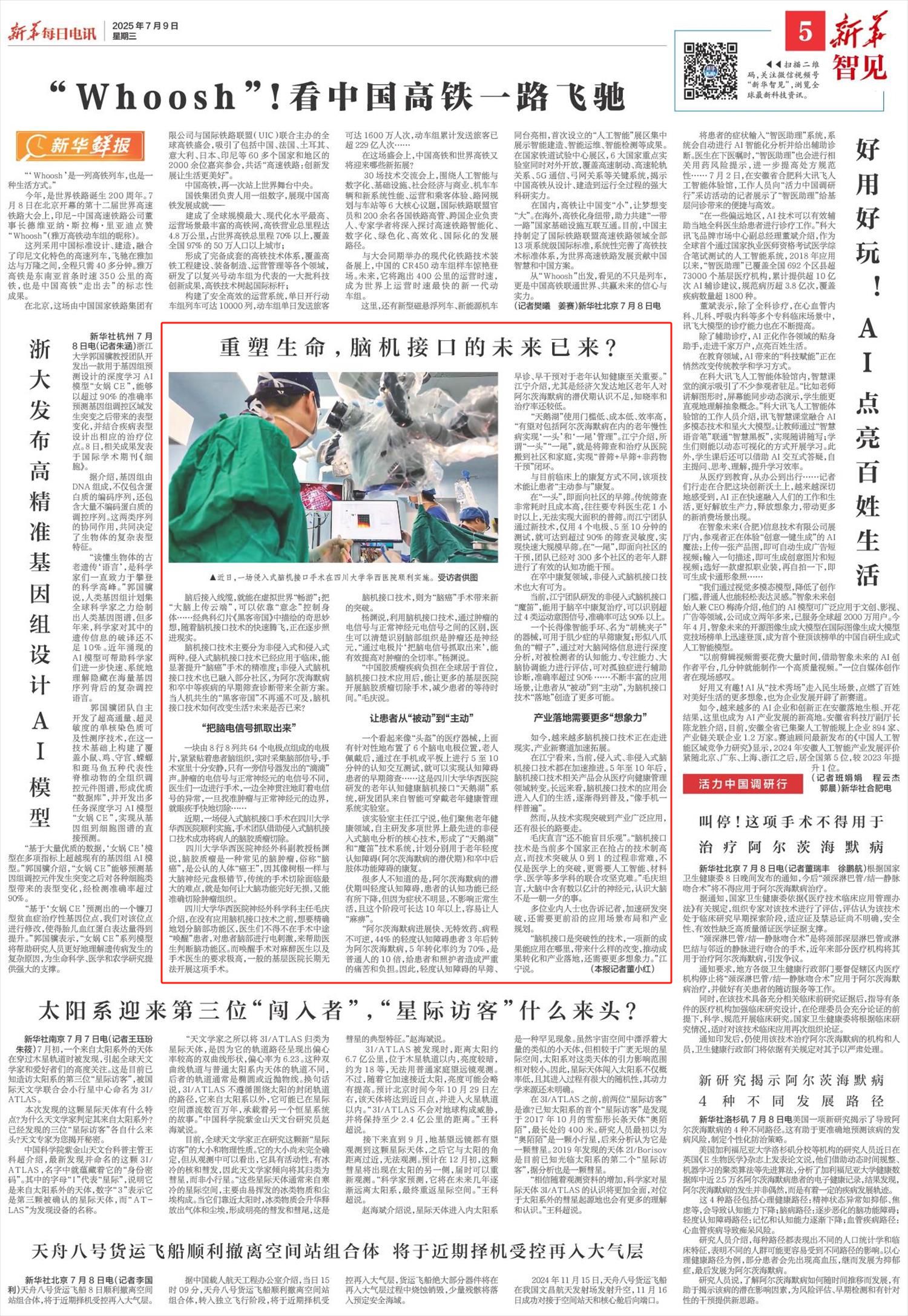 脑后接入线缆,就能在虚拟世界“畅游”;把“大脑上传云端”,可以依靠“意念”控制身体……经典科幻片《黑客帝国》中描绘的奇思妙想,随着脑机接口技术的快速腾飞,正在逐步照进现实。