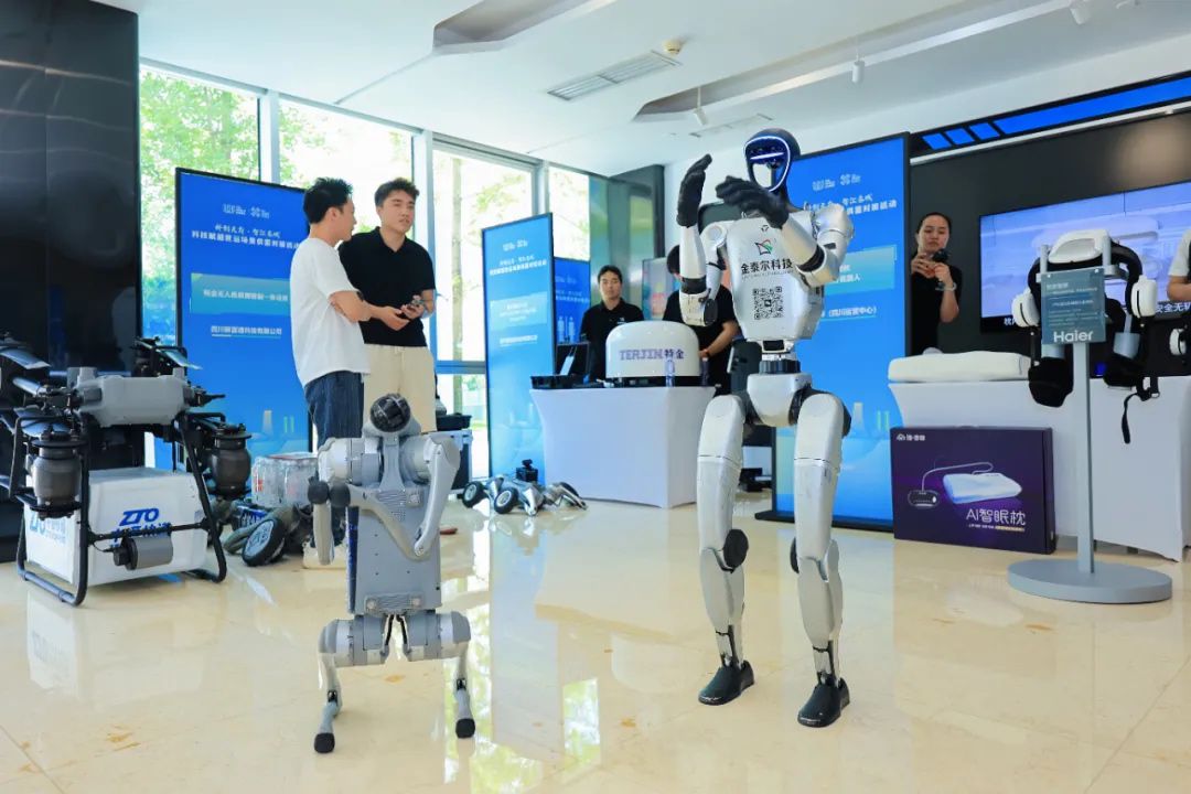 人形机器人稳步行走,四足机器狗作揖行礼,运输机器人驮着一箱矿泉水展示负重能力……活动现场展示区,20余款科技产品集中亮相,带来科技感十足的体验。