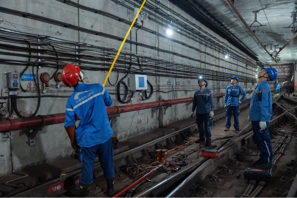 信号检修工曾鑫徒步了2公里,检查道岔转辙机、紧固螺栓、排查配线等。而轨道探伤工王溢然手持5公斤重的探伤仪,对钢轨进行扫描。“每寸钢轨每天承受数千次列车碾压,内部损伤检测定位误差必须控制在1毫米内。”每晚,约100名探伤工分散在不同区间点位工作。冯旭杰介绍,在国内,地铁普遍采用双线轨道设计,因此不具备边运行边检修的条件,轨行区的检修作业需在停运后开展。这成为了安全规程的铁律。“由于非运营时间有限,受限于安全流程和区间的物理长度,实际工作人员可用时间极短,工作压力大。”