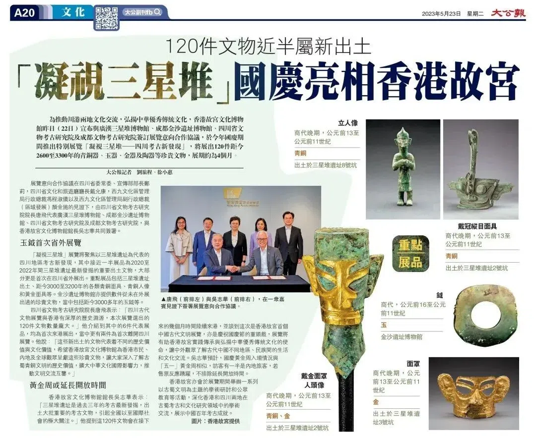 2023年9月在香港故宫文化博物馆举办的“凝视三星堆——四川考古新发现”特别展览,经由《南华早报》《大公报》连续报道,吸引了马来西亚《星报》等多家东南亚媒体和文博自媒体的关注。
