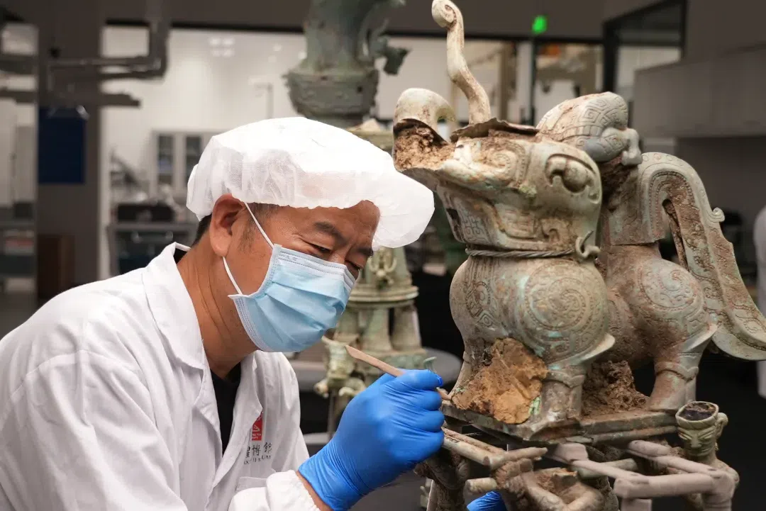 ▲三星堆青铜神坛神兽修复。图据三星堆博物馆