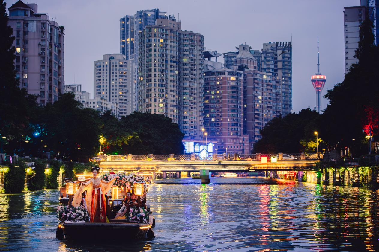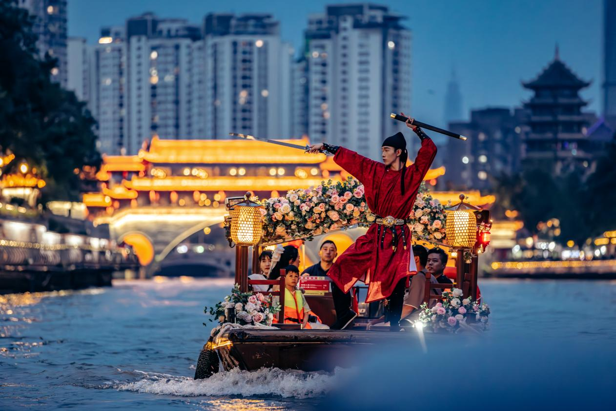 现在,“夜游锦江”创新开展“游船+”融合模式,推出多种主题游船,例如水上火锅船、MR数字游船(混合现实技术)、锦江茶舫等多种特色产品;沿岸布局多个消费空间(如自得茶馆、主题市集),还结合汉服巡游、非遗体验、剧本杀等活动打造特色游玩体验。