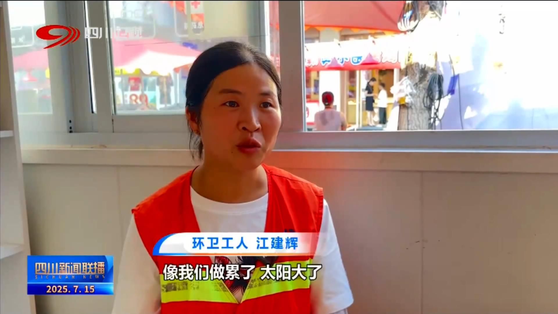 环卫工人 江建辉:像我们做累了,太阳大了,都可以进来乘凉、看电视,可以稍微歇息一下,有空调吹、有水喝,都是免费的。